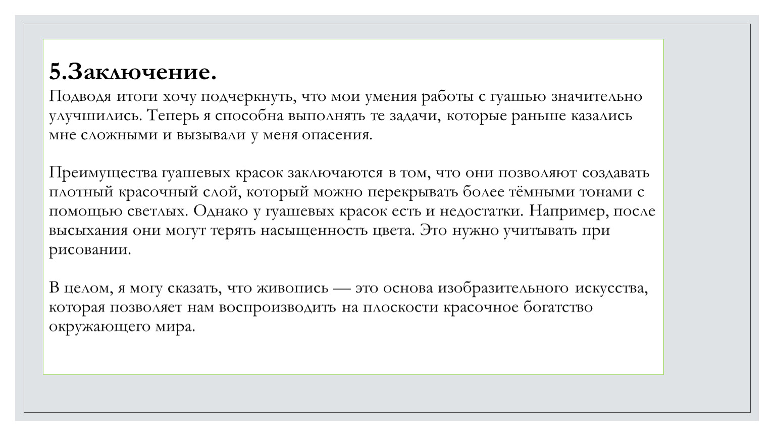 5.Заключение.Подводя итоги хочу подчеркнуть, что мои умения работы с гуашью значительно улучшились. Теперь я способна выполнять те задачи, которые раньше казались мне сложными и вызывали у меня опасения.Преимущества гуашевых красок заключаются в том, что они позволяют создавать плотный красочный слой, который можно перекрывать более тёмными тонами с помощью светлых. Однако у гуашевых красок есть и недостатки. Например, после высыхания они могут терять насыщенность цвета. Это нужно учитывать при рисовании.В целом, я могу сказать, что живопись — это основа изобразительного искусства, которая позволяет нам воспроизводить на плоскости красочное богатство окружающего мира.