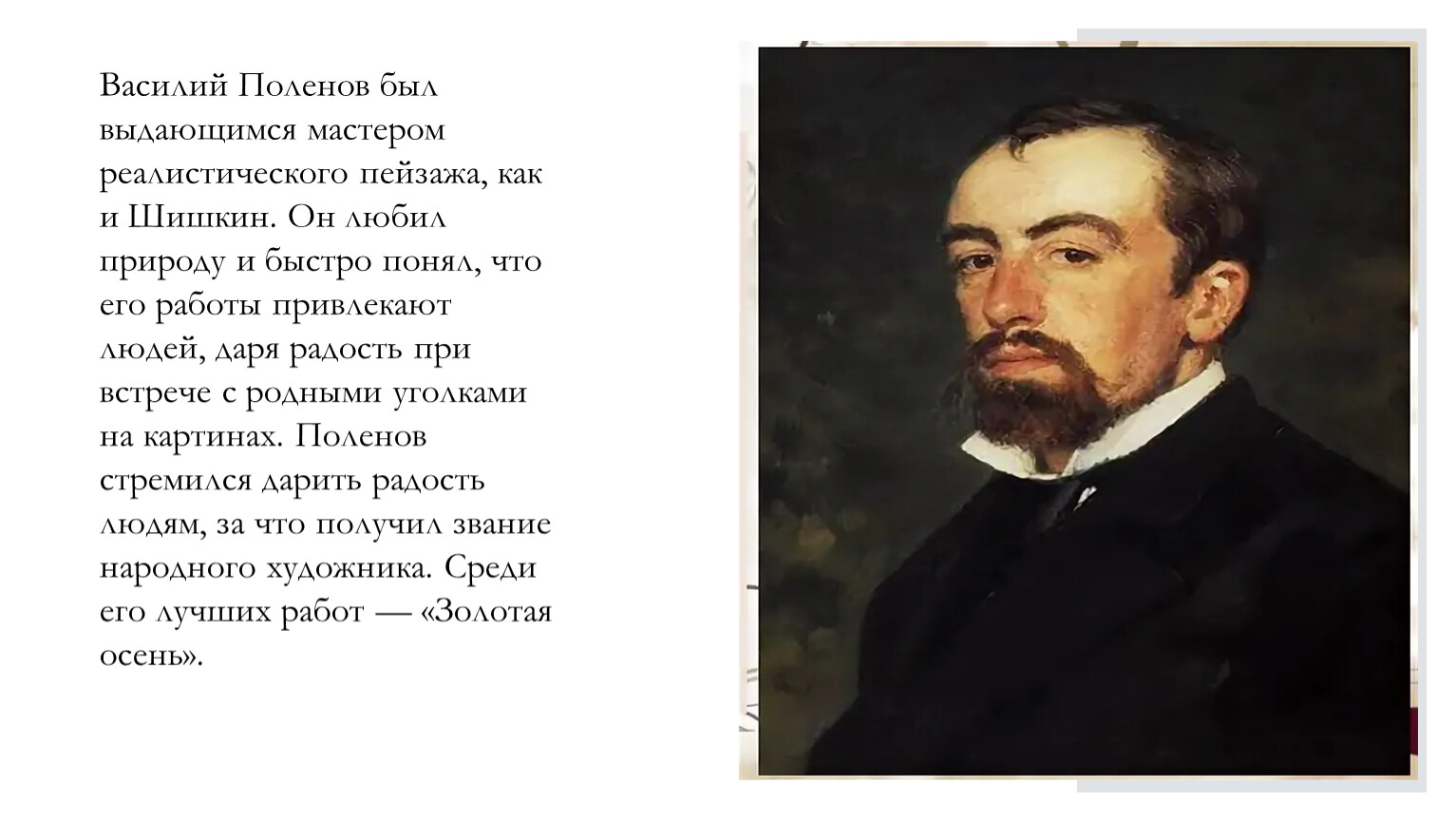 Василий Поленов был выдающимся мастером реалистического пейзажа, как и Шишкин. Он любил природу и быстро понял, что его работы привлекают людей, даря радость при встрече с родными уголками на картинах. Поленов стремился дарить радость людям, за что получил звание народного художника. Среди его лучших работ — «Золотая осень».