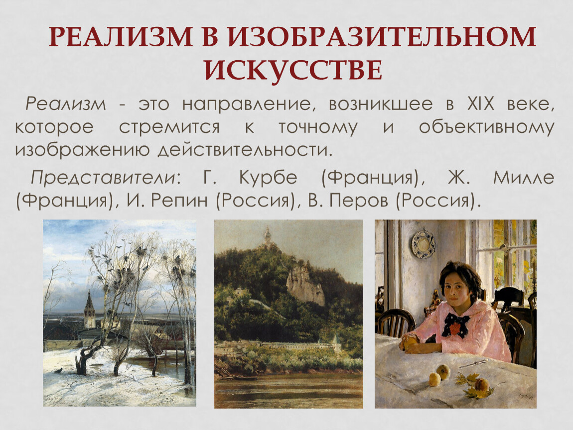 Представители: Г. Курбе (Франция), Ж. Милле (Франция), И. Репин (Россия), В. Перов (Россия).