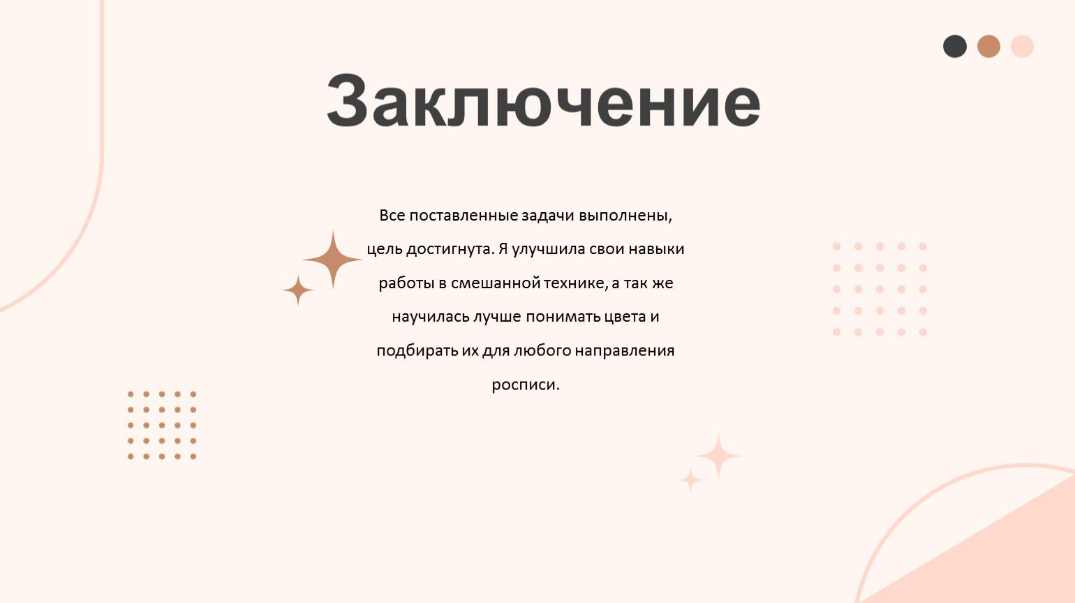 Все поставленные задачи выполнены, цель достигнута. Я улучшила свои навыки работы в смешанной технике, а так же научилась лучше понимать цвета и подбирать их для любого направления росписи.