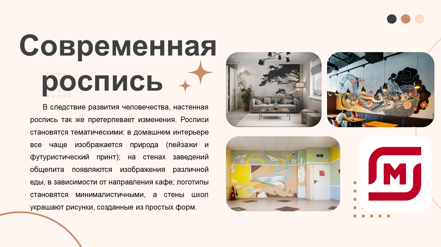 В следствие развития человечества, настенная роспись так же претерпевает изменения. Росписи становятся тематическими: в домашнем интерьере все чаще изображается природа (пейзажи и футуристический принт); на стенах заведений общепита появляются изображения различной еды, в зависимости от направления кафе; логотипы становятся минималистичными, а стены школ украшают рисунки, созданные из простых форм.