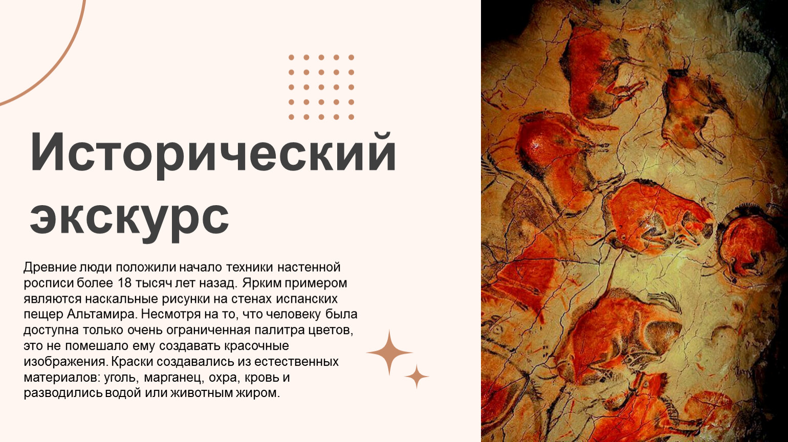 Древние люди положили начало техники настенной росписи более 18 тысяч лет назад. Ярким примером являются наскальные рисунки на стенах испанских пещер Альтамира. Несмотря на то, что человеку была доступна только очень ограниченная палитра цветов, это не помешало ему создавать красочные изображения. Краски создавались из естественных материалов: уголь, марганец, охра, кровь и разводились водой или животным жиром.