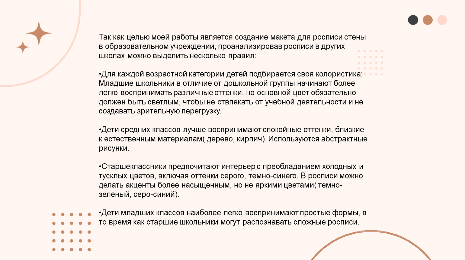 Так как целью моей работы является создание макета для росписи стены в образовательном учреждении, проанализировав росписи в других школах можно выделить несколько правил: