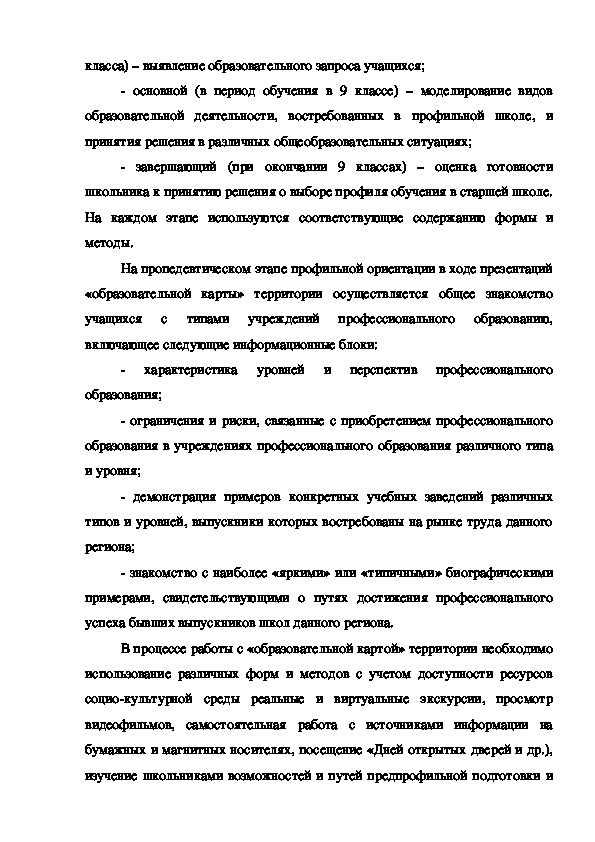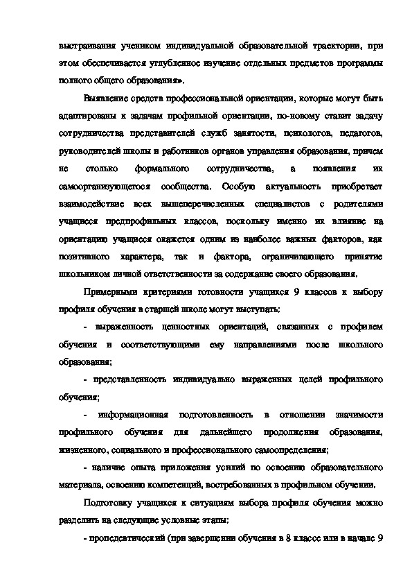 профиля обучения; реализуются «пробы выбора профиля обучения» серии