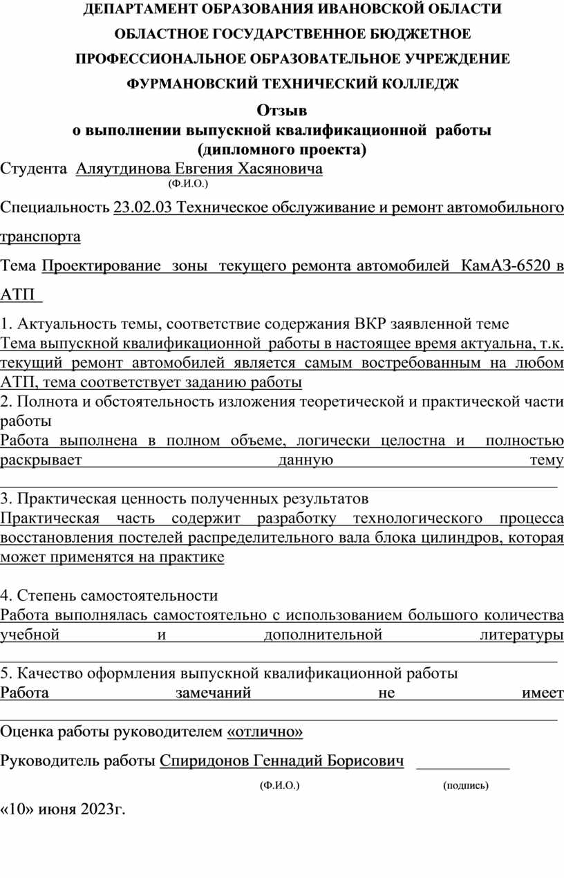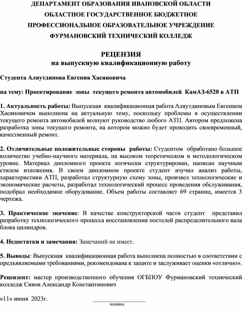 1. Актуальность работы: Выпускная квалификационная работа Аляутдиновым Евгением Хасяновичем выполнена на актуальную тему, поскольку проблемы в осуществлении текущего ремонта автомобилей волнуют руководство любого АТП. Автором предложена разработка зоны текущего ремонта, на котором можно будет проводить своевременный, качественный ремонт.
