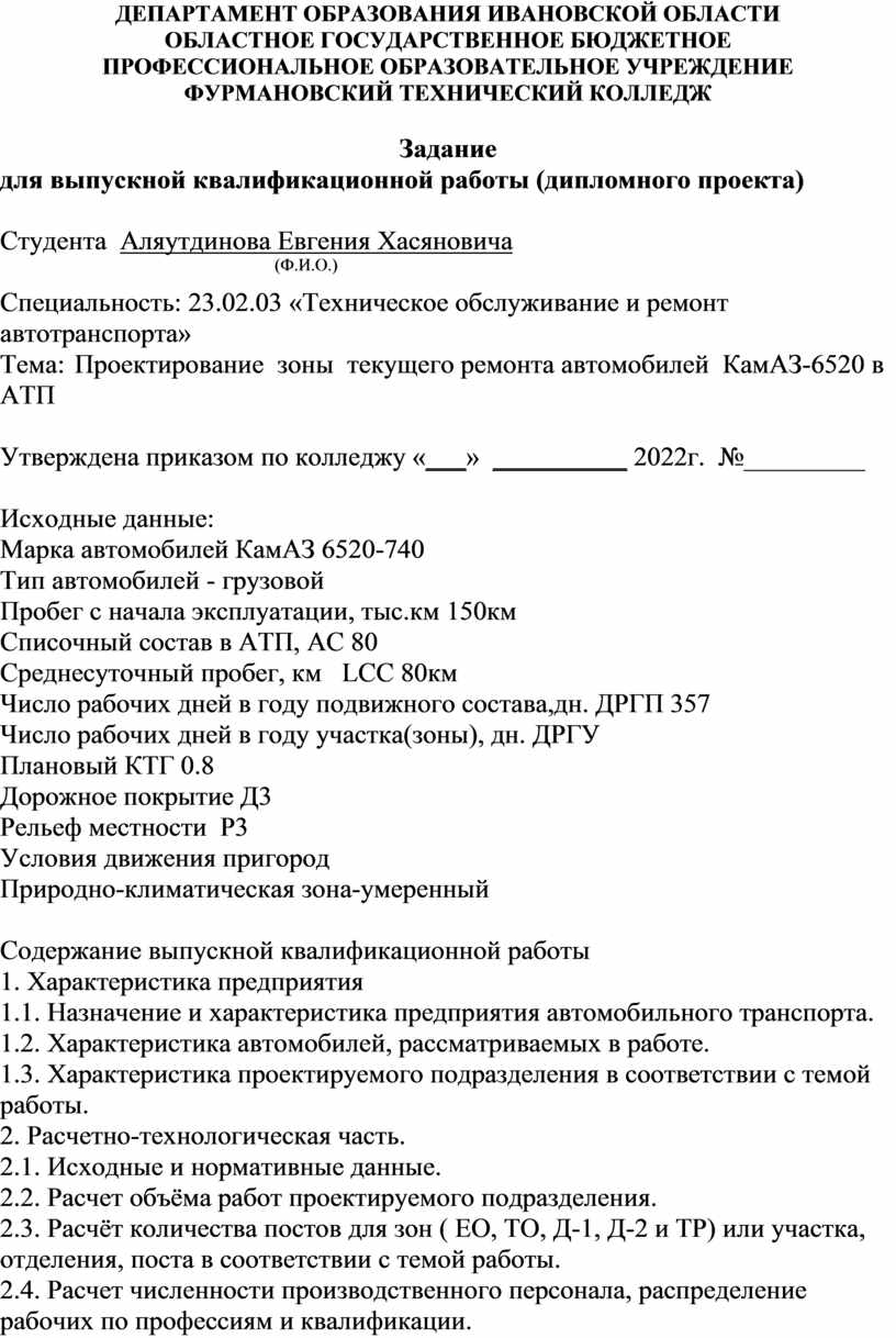 Тема выпускной квалификационной работы в настоящее время актуальна, т.к. текущий ремонт автомобилей является самым востребованным на любом АТП, тема соответствует заданию работы