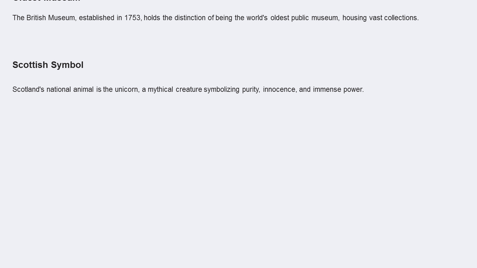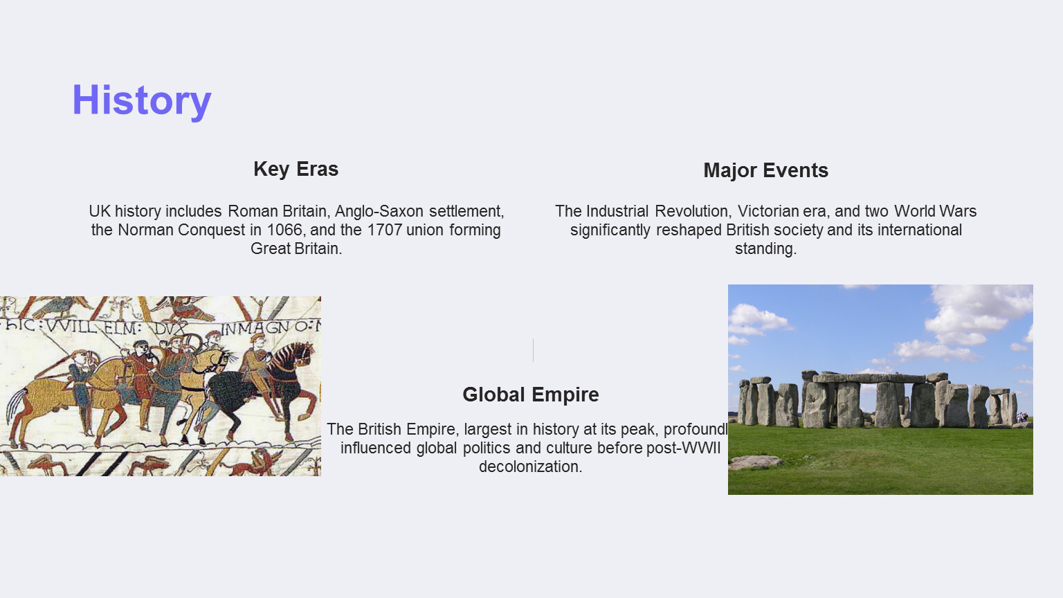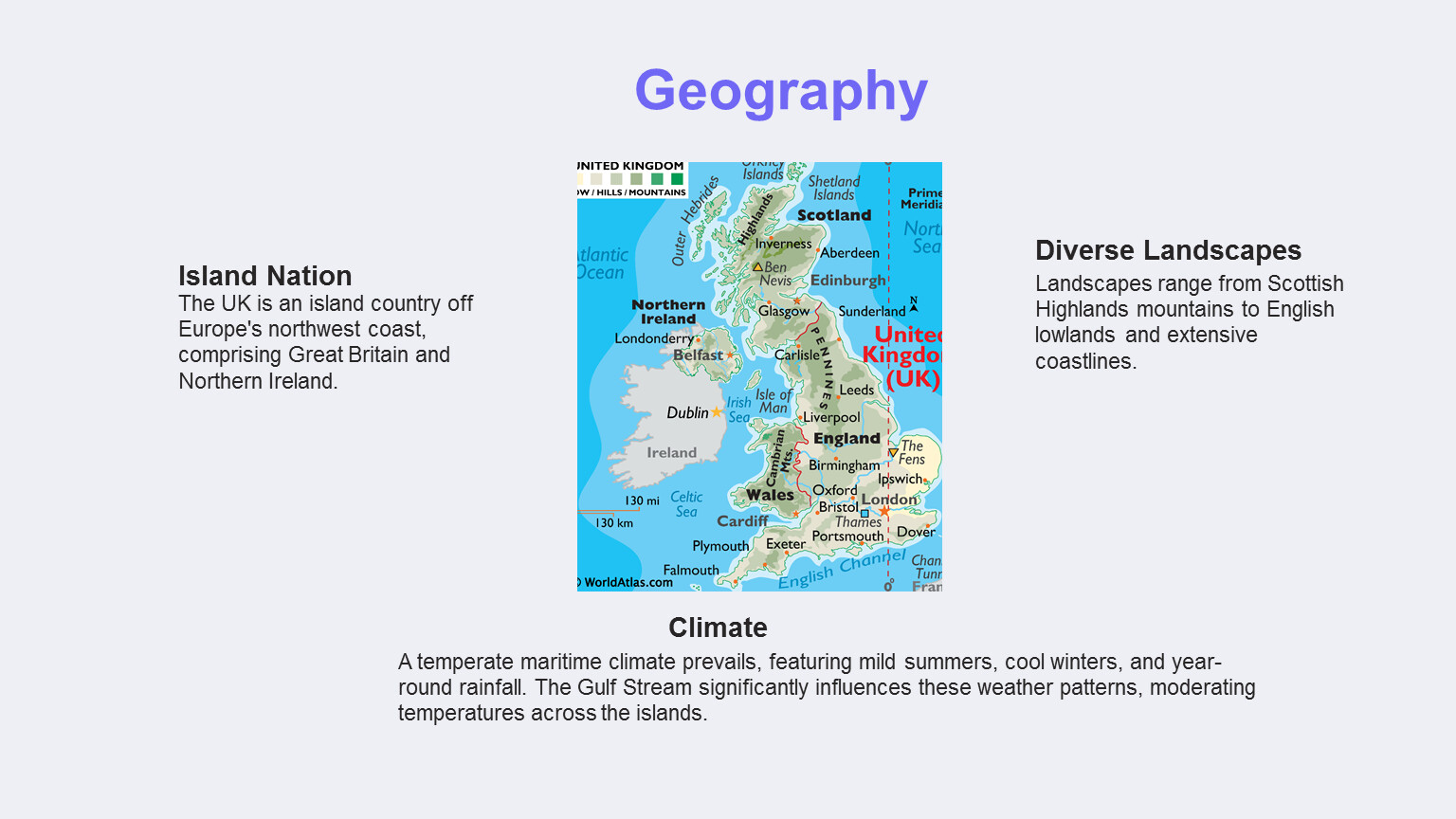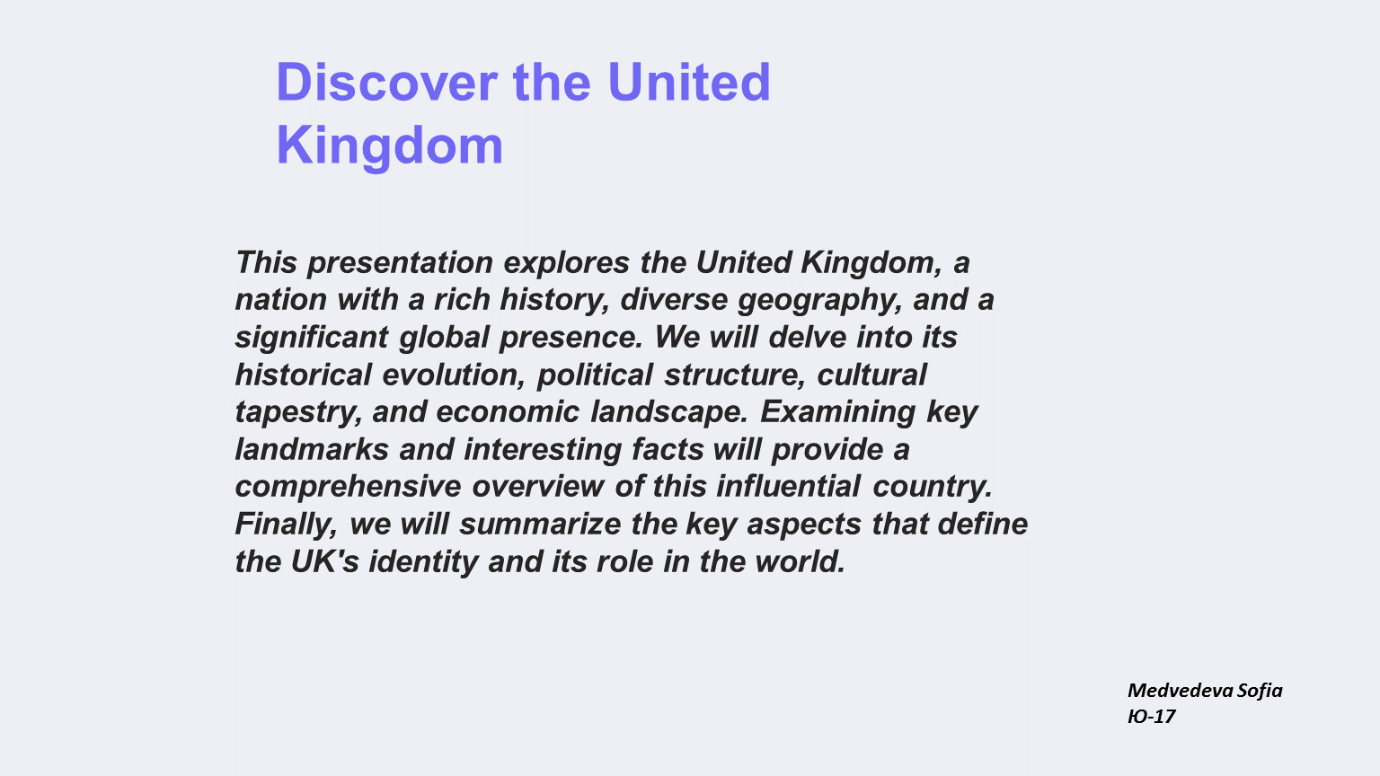 This presentation explores the United Kingdom, a nation with a rich history, diverse geography, and a significant global presence. We will delve into its historical evolution, political structure, cultural tapestry, and economic landscape. Examining key landmarks and interesting facts will provide a comprehensive overview of this influential country. Finally, we will summarize the key aspects that define the UK's identity and its role in the world.