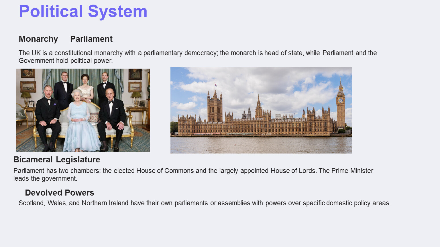 The UK is a constitutional monarchy with a parliamentary democracy; the monarch is head of state, while Parliament and the Government hold political power.