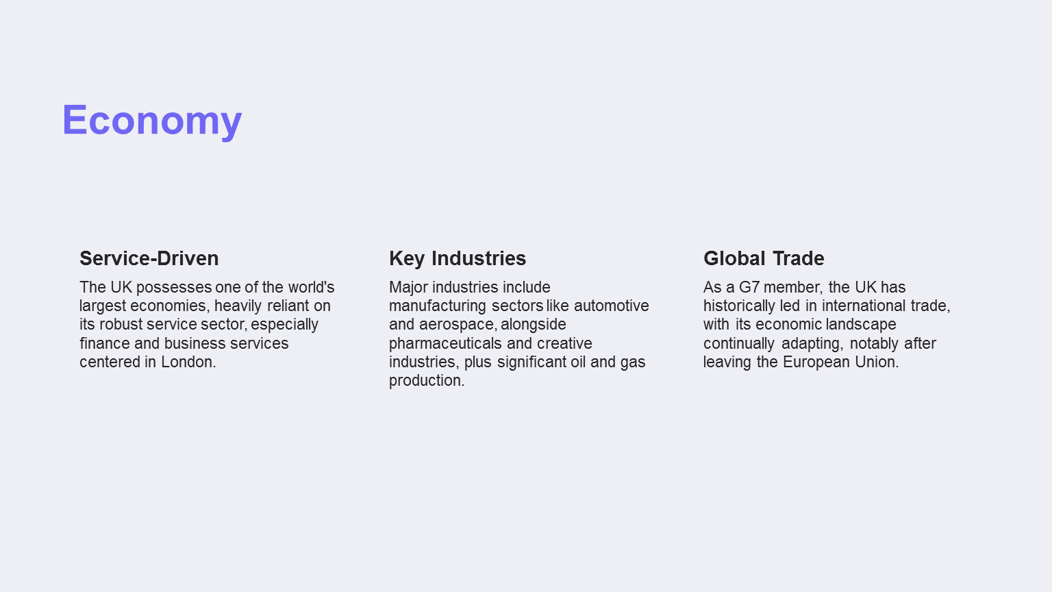 The UK possesses one of the world's largest economies, heavily reliant on its robust service sector, especially finance and business services centered in London.