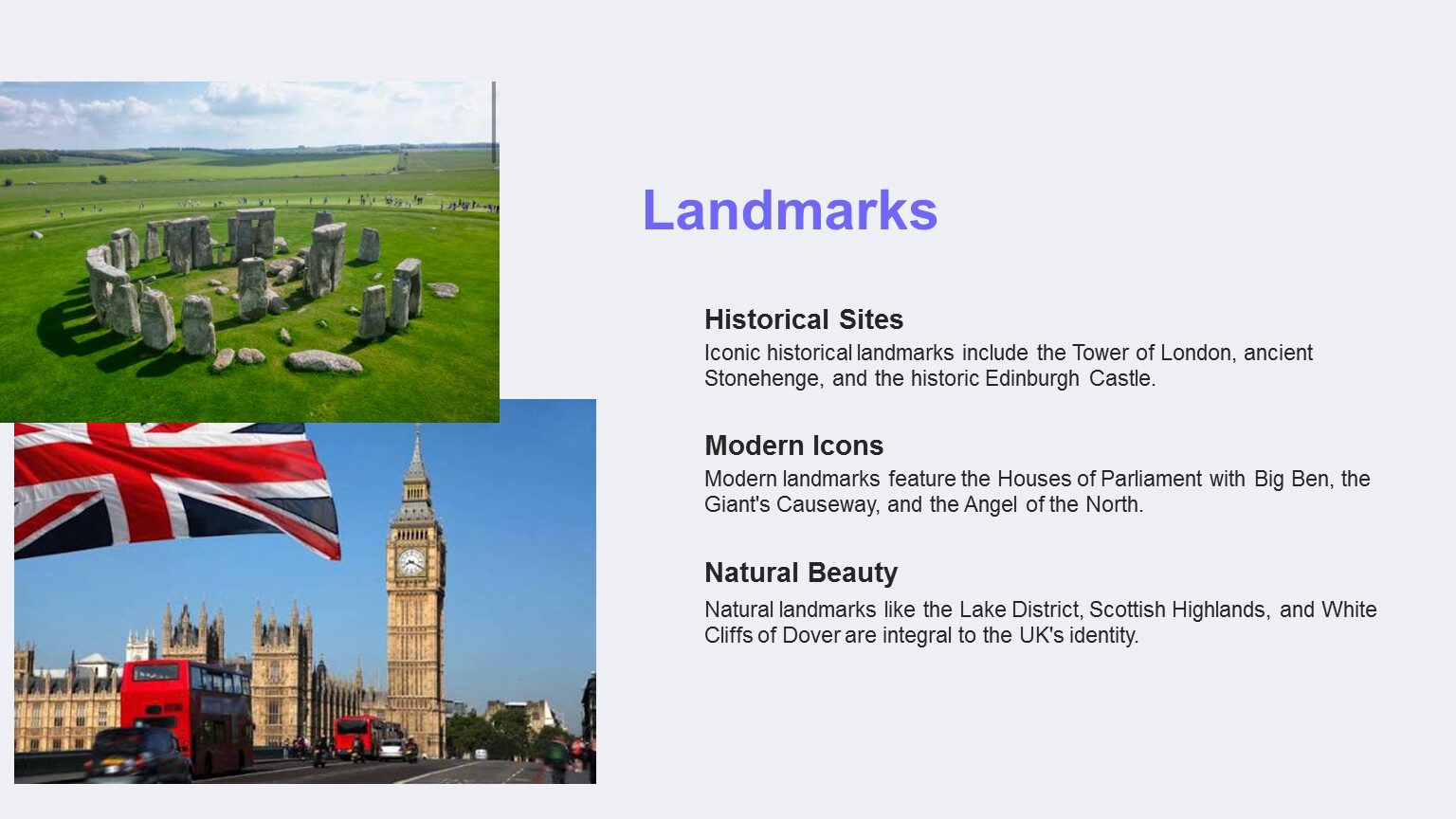 Iconic historical landmarks include the Tower of London, ancient Stonehenge, and the historic Edinburgh Castle.