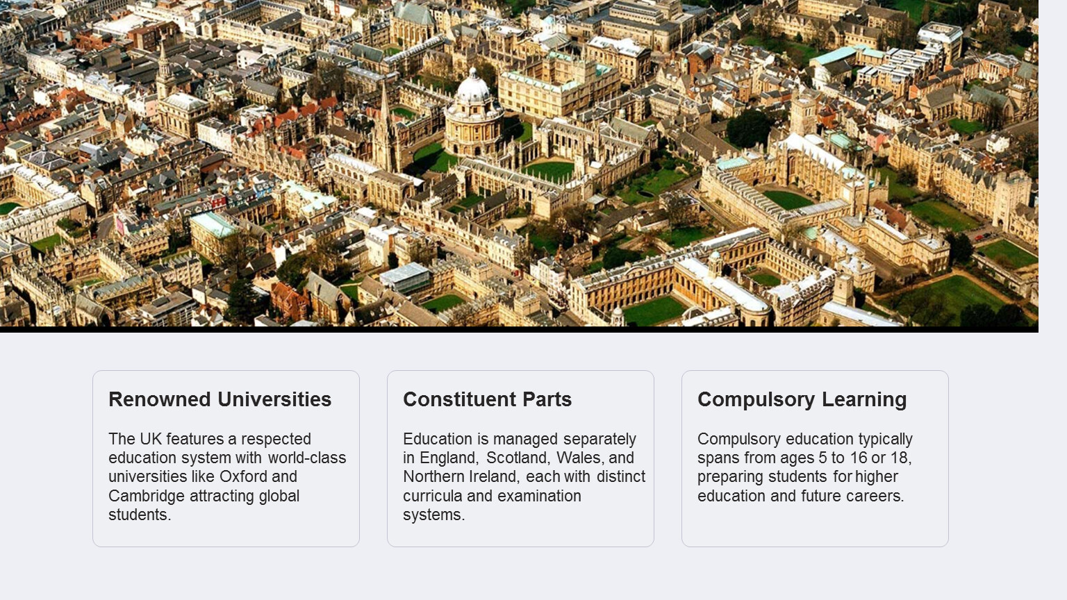 The UK features a respected education system with world-class universities like Oxford and Cambridge attracting global students.