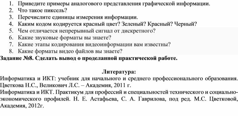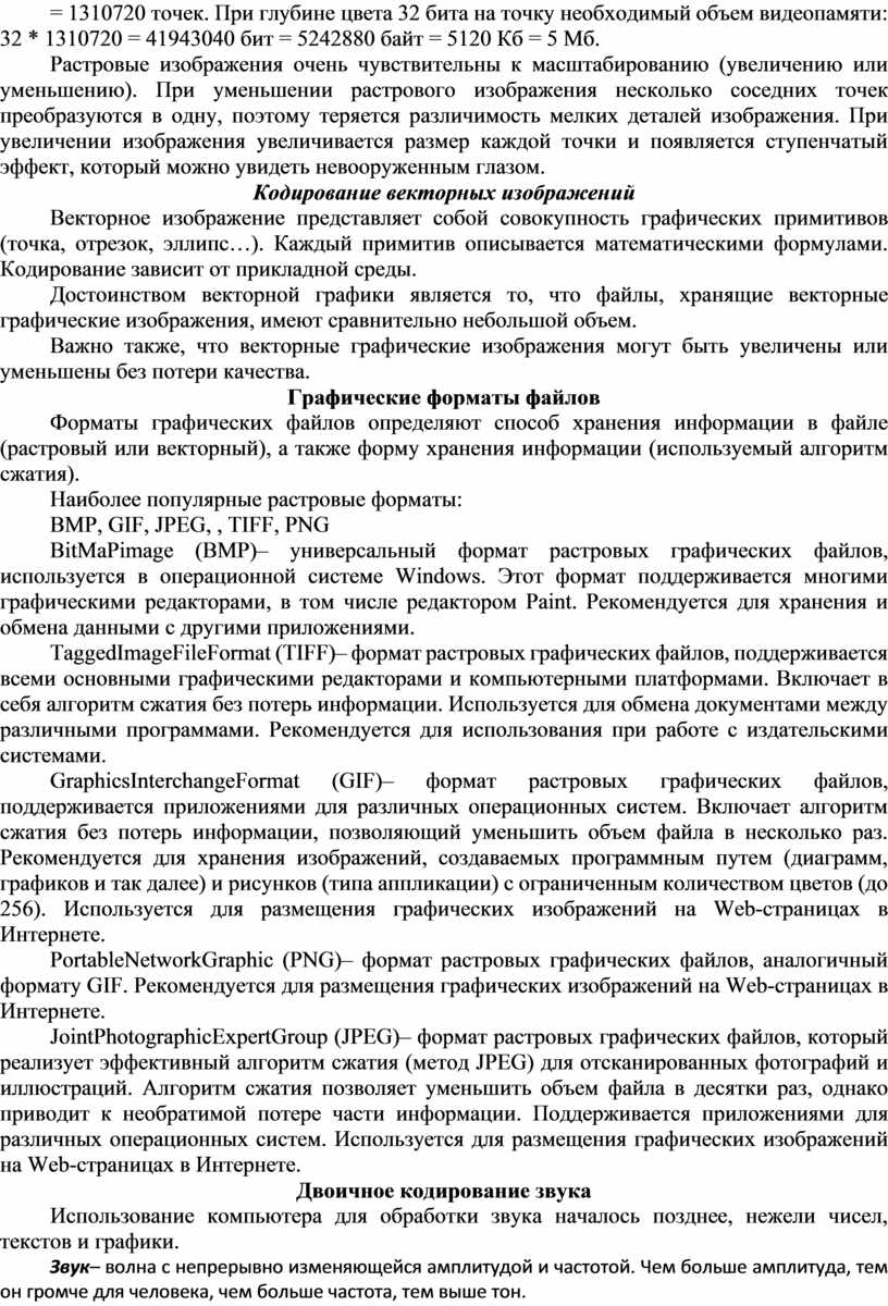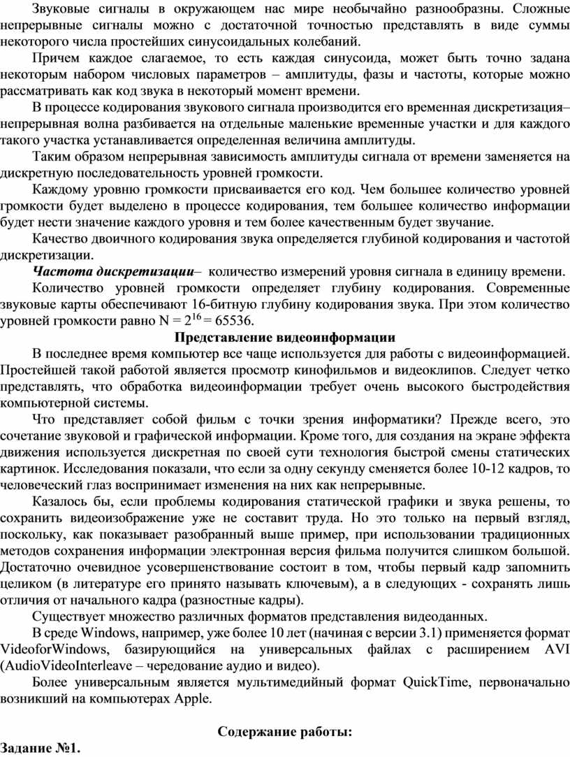 Цели занятия: изучить способы представления текстовой, графической, звуковой информации и видеоинформации.