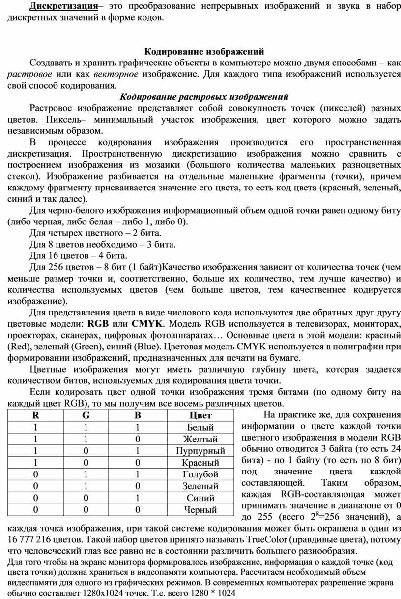 Дискретизация– это преобразование непрерывных изображений и звука в набор дискретных значений в форме кодов.