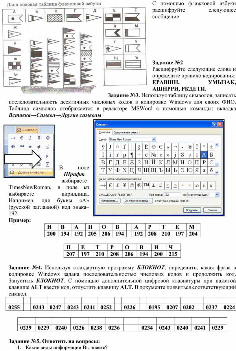 Задание №3. Используя таблицу символов, записать последовательность десятичных числовых кодов в кодировке Windows для своих ФИО. Таблица символов отображается в редакторе MSWord с помощью команды: вкладка Вставка→Символ→Другие символы