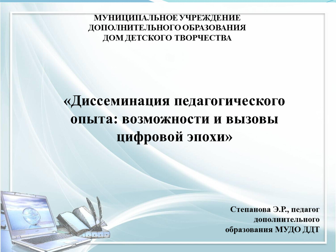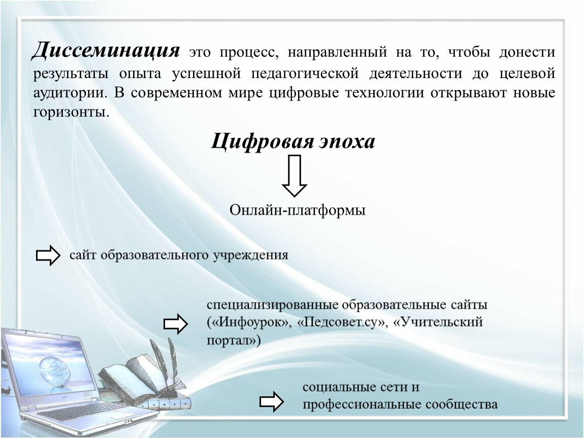 Диссеминация это процесс, направленный на то, чтобы донести результаты опыта успешной педагогической деятельности до целевой аудитории. В современном мире цифровые технологии открывают новые горизонты.