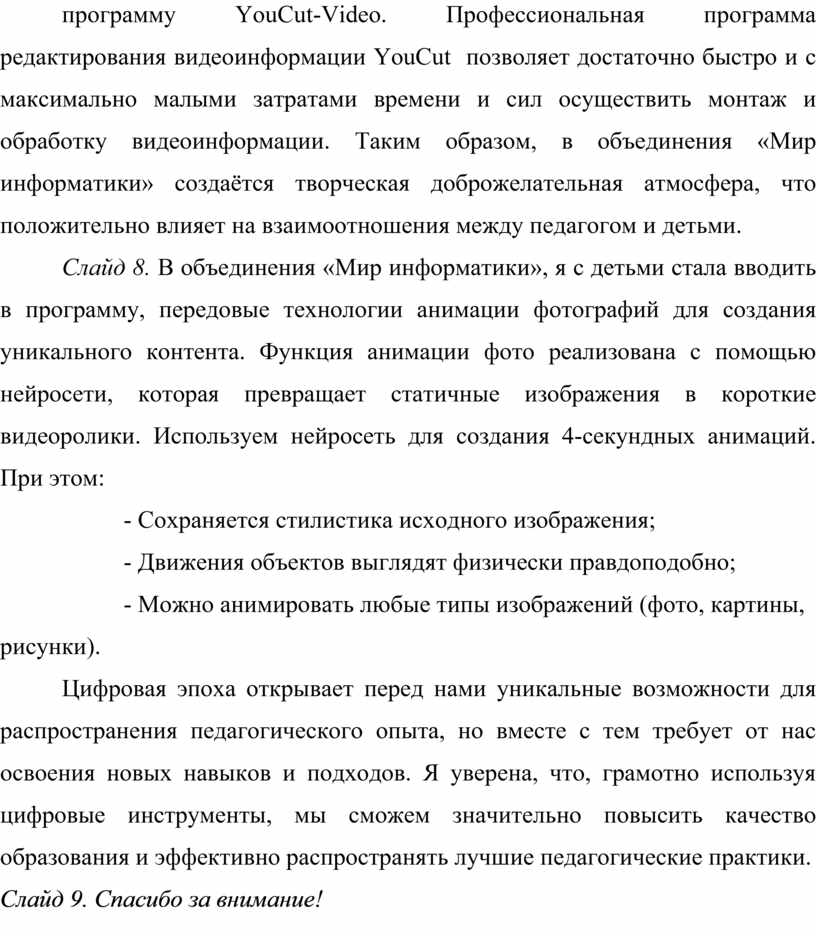 Слайд 8. В объединения «Мир информатики», я с детьми стала вводить в программу, передовые технологии анимации фотографий для создания уникального контента. Функция анимации фото реализована с помощью нейросети, которая превращает статичные изображения в короткие видеоролики. Используем нейросеть для создания 4-секундных анимаций. При этом: