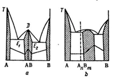 Диаграмма состоит из двух эвтектических диаграмм с областями твердых растворов при наличии одной дистектической точки D, разделяющей диаграмму. Так как дистектической точке часто отвечает стехиометрический состав, например АВ, то Н.С.Курнаков предложил называть такие точки дальтоновскими . К каждой из этих частей диаграммы полностью относится сказанное выше об эвтектической диаграмме с твердыми растворами. Фаза переменного состава , в пределах области гомогенности которой находится дальтоновская точка, называется дальтонидом или дальтонидной фазой. Причем на кривых состав –свойство этой точке соответствует максимум (например точка плавления на рис.11.5,а) или минимум (например точка на кривой электросопротивления, см.рис.11.8,V). В случае дальтоновской точки (рис.11.5,a) можно сделать вывод о присутствии в системе соединения переменного состава . Существует еще одна диаграмма (на рис.11.5,b) указывающая на отсутствие максимумов или минимумов на кривых свойств в пределах твердого раствора . Н. С. Курнаков обьяснил это так «если соединение, на котором основана фаза , лежит за пределами области гомогенности, такая фаза называется бертоллидной или бертоллидом».(Бертоллиды Курнакова).