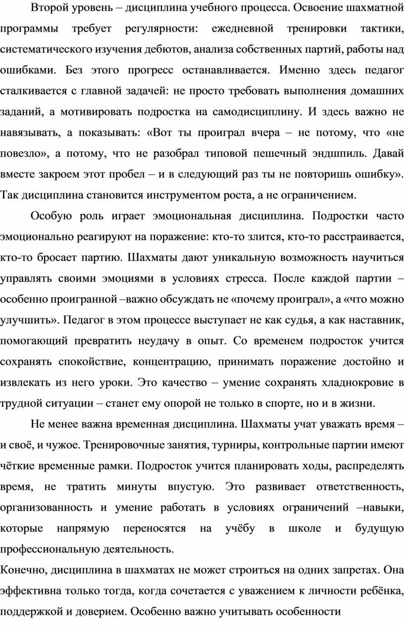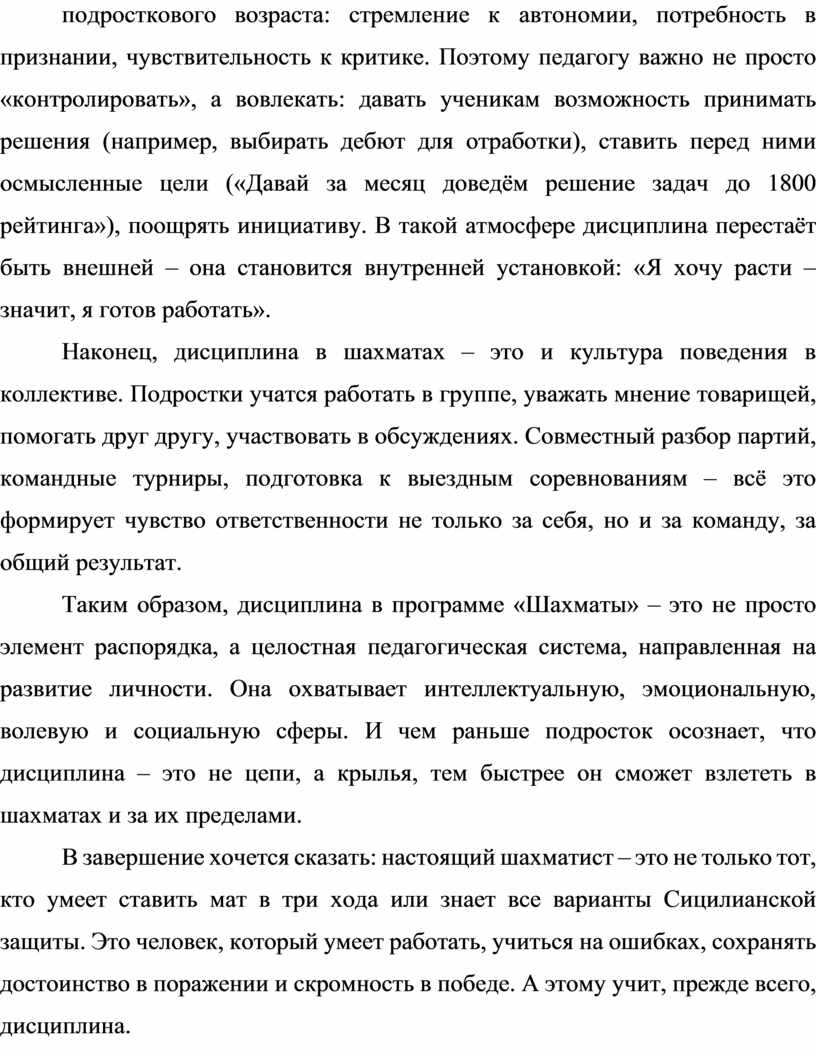 Таким образом, дисциплина в программе «Шахматы» – это не просто элемент распорядка, а целостная педагогическая система, направленная на развитие личности. Она охватывает интеллектуальную, эмоциональную, волевую и социальную сферы. И чем раньше подросток осознает, что дисциплина – это не цепи, а крылья, тем быстрее он сможет взлететь в шахматах и за их пределами.