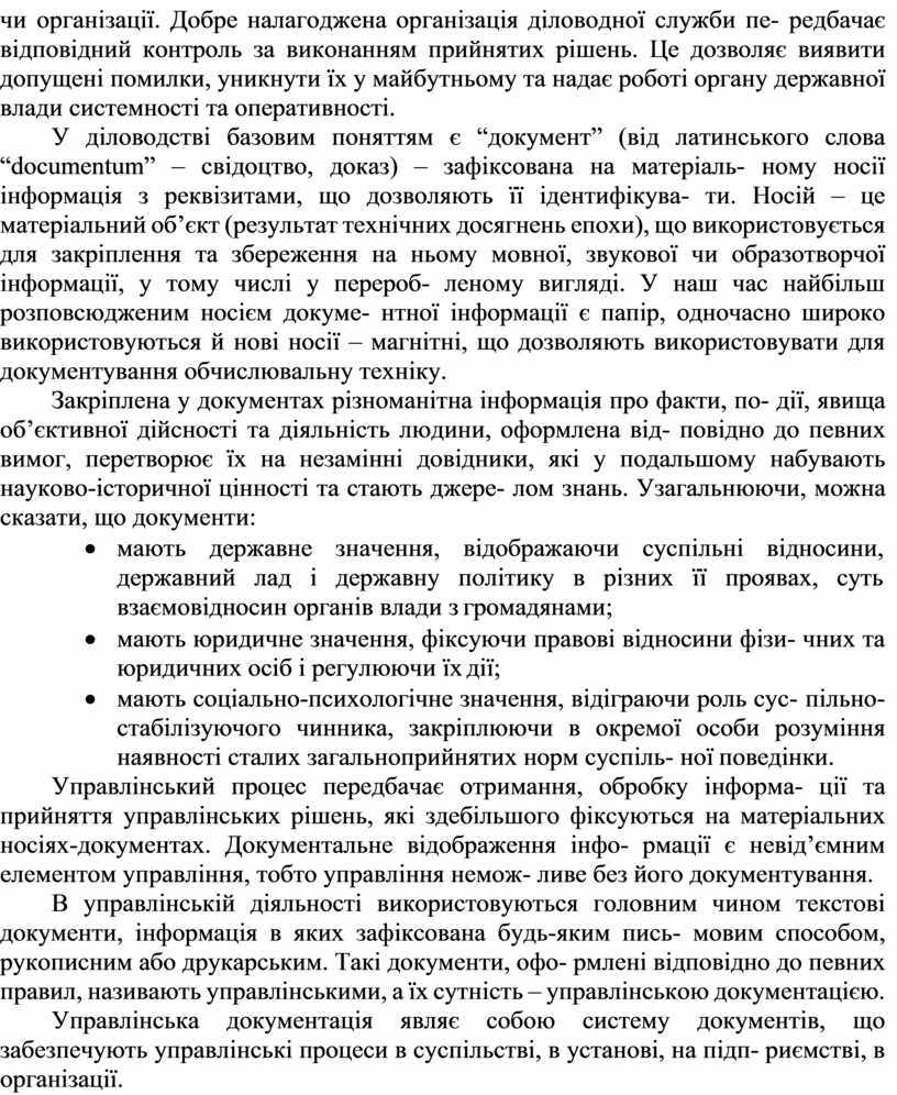 Управлінський процес передбачає отримання, обробку інформа- ції та прийняття управлінських рішень, які здебільшого фіксуються на матеріальних носіях-документах. Документальне відображення інфо- рмації є невід’ємним елементом управління, тобто управління немож- ливе без його документування.