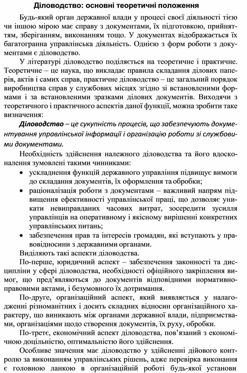 У літературі діловодство поділяється на теоретичне і практичне. Теоретичне – це наука, що викладає правила складання ділових папе- рів, актів і самих справ, практичне діловодство – це загальний порядок виробництва справ у службових місцях згідно зі встановленими фор- мами і за встановленими зразками ділових документів. Виходячи з теоретичного і практичного аспектів даної функції, можна зробити таке визначення: