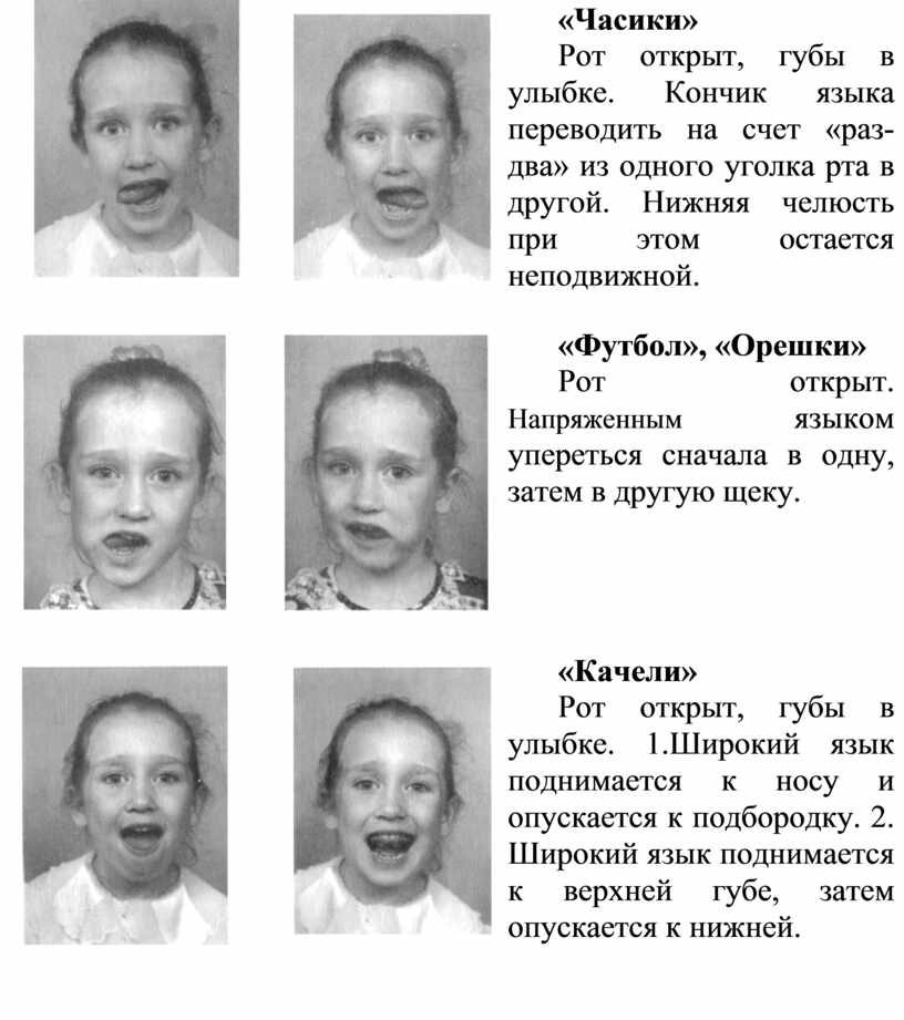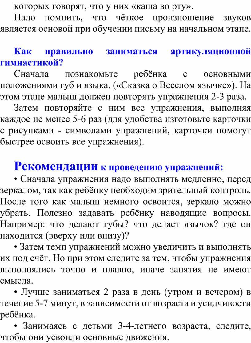 • Сначала упражнения надо выполнять медленно, перед зеркалом, так как ребёнку необходим зрительный контроль. После того как малыш немного освоится, зеркало можно убрать. Полезно задавать ребёнку наводящие вопросы. Например: что делают губы? что делает язычок? где он находится (вверху или внизу)?