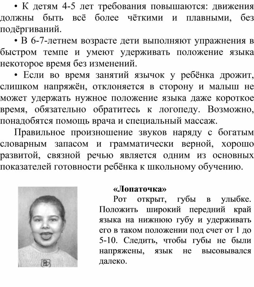 • В 6-7-летнем возрасте дети выполняют упражнения в быстром темпе и умеют удерживать положение языка некоторое время без изменений.