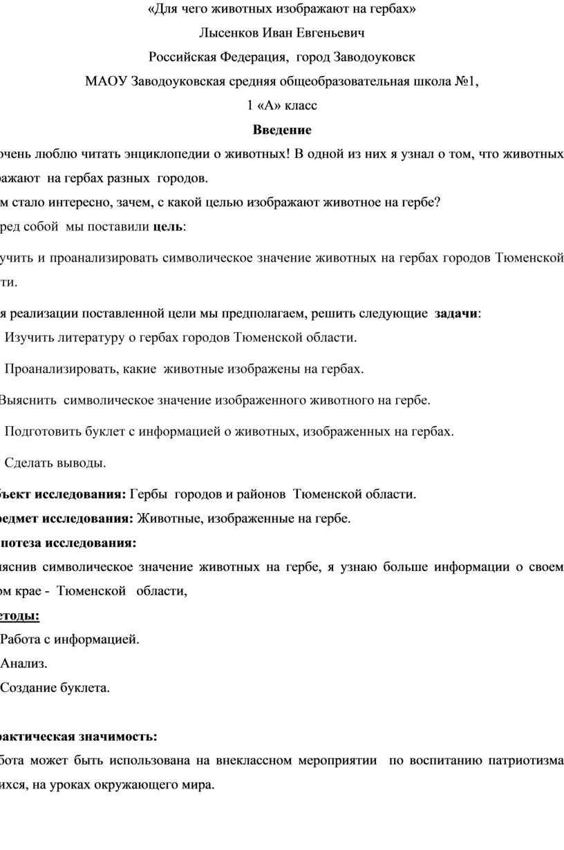 Выяснив символическое значение животных на гербе, я узнаю больше информации о своем родном крае - Тюменской области,