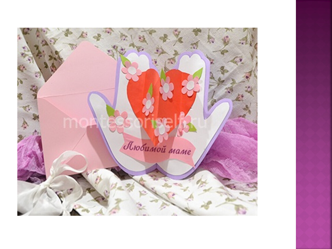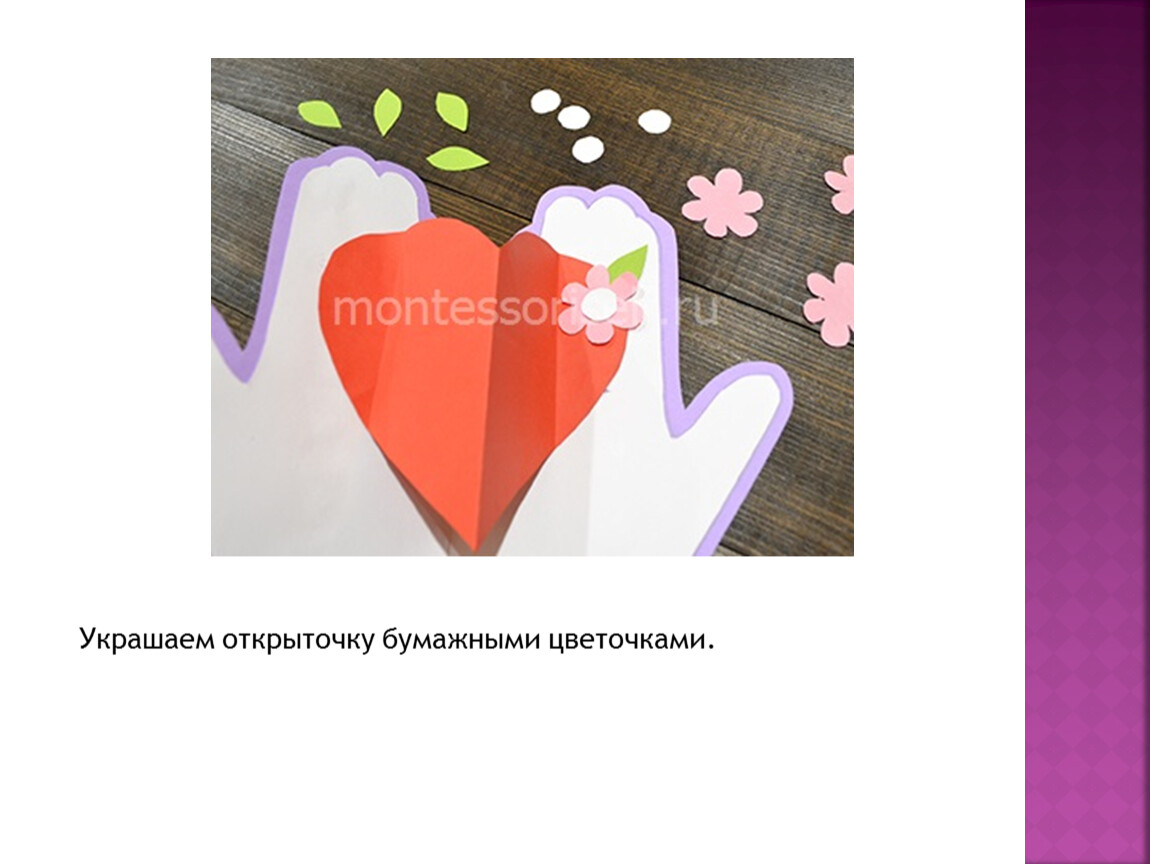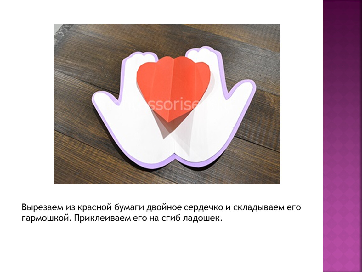 Вырезаем из красной бумаги двойное сердечко и складываем его гармошкой. Приклеиваем его на сгиб ладошек.