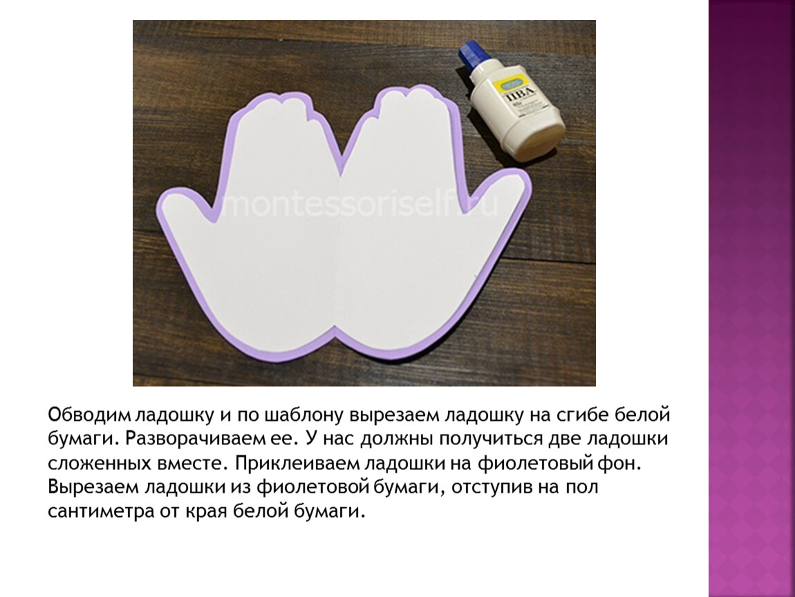 Обводим ладошку и по шаблону вырезаем ладошку на сгибе белой бумаги. Разворачиваем ее. У нас должны получиться две ладошки сложенных вместе. Приклеиваем ладошки на фиолетовый фон. Вырезаем ладошки из фиолетовой бумаги, отступив на пол сантиметра от края белой бумаги.