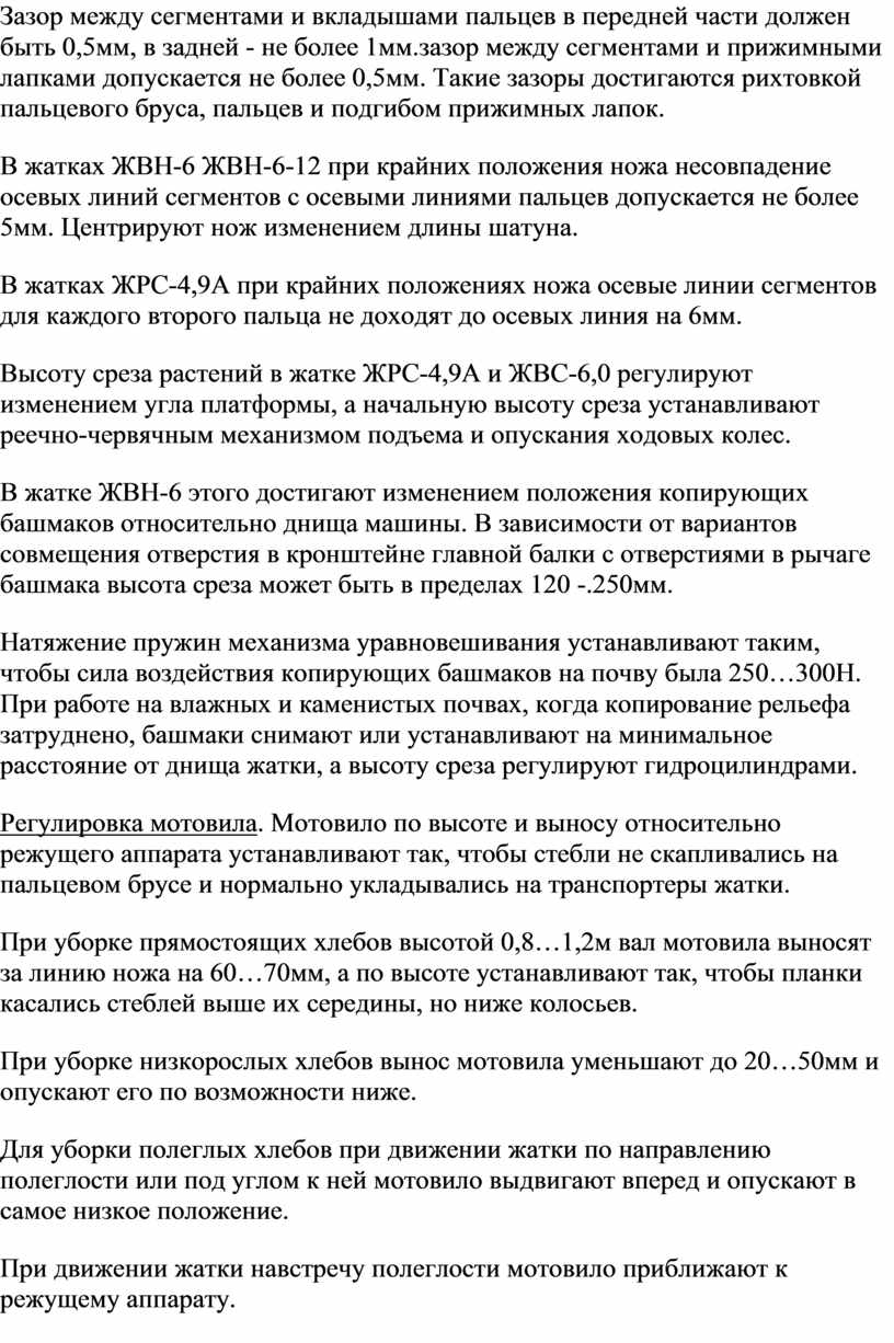 Регулируют зазор в измельчающем аппарате между лезвиями ножей и режущей кромкой противорежущего бруса в пределах 0,4–1,0 мм при неработающем двигателе путем перемещения противорежущего бруса упорными болтами. Зазор между измельчающим барабаном и отсекателем массы регулируют в пределах 5 – 10 мм перемещением отсекателя в овальных отверстиях при отпущенных четырех фиксирующих болтах, которые после регулировки затягивают.