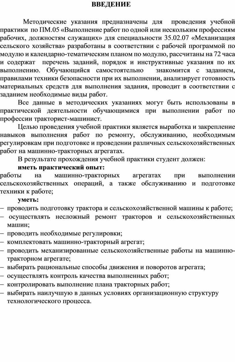 Методические указания предназначены для проведения учебной практики по ПМ.05 «Выполнение работ по одной или нескольким профессиям рабочих, должностям служащих» для специальности 35.02.07 «Механизация сельского хозяйства» разработаны в соответствии с рабочей программой по модулю и календарно-тематическим планом по модулю, рассчитаны на 72 часа и содержат перечень заданий, порядок и инструктивные указания по их выполнению. Обучающийся самостоятельно знакомится с заданием, правилами техники безопасности при их выполнении, анализирует готовность материальных средств для выполнения задания, проводит в соответствии с заданием необходимые виды работ.
