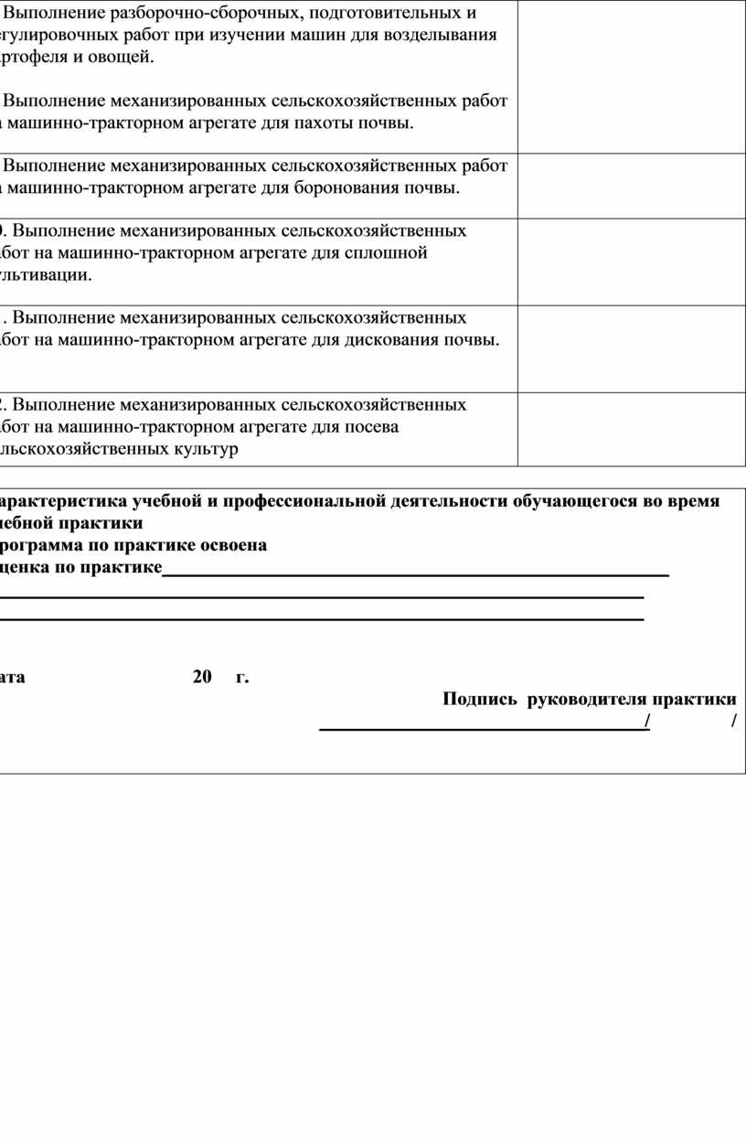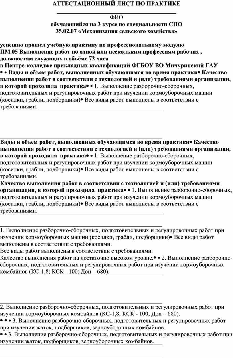АТТЕСТАЦИОННЫЙ ЛИСТ ПО ПРАКТИКЕ ________________________________________ ФИО обучающийся на 3 курсе по специальности СПО 35.02.07 «Механизация сельского хозяйства»