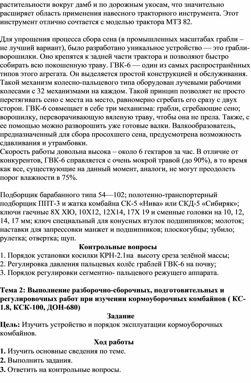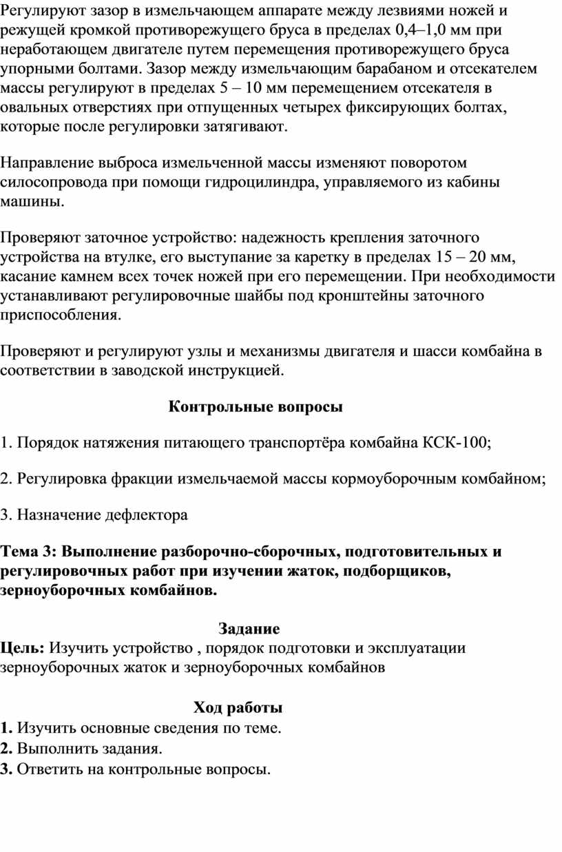 Тема 2: Выполнение разборочно-сборочных, подготовительных и регулировочных работ при изучении кормоуборочных комбайнов ( КС-1.8, КСК-100, ДОН-680)