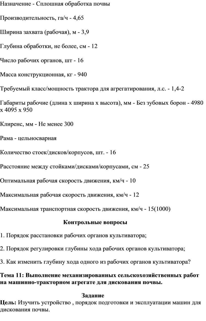 Тема 11: Выполнение механизированных сельскохозяйственных работ на машинно-тракторном агрегате для дискования почвы.