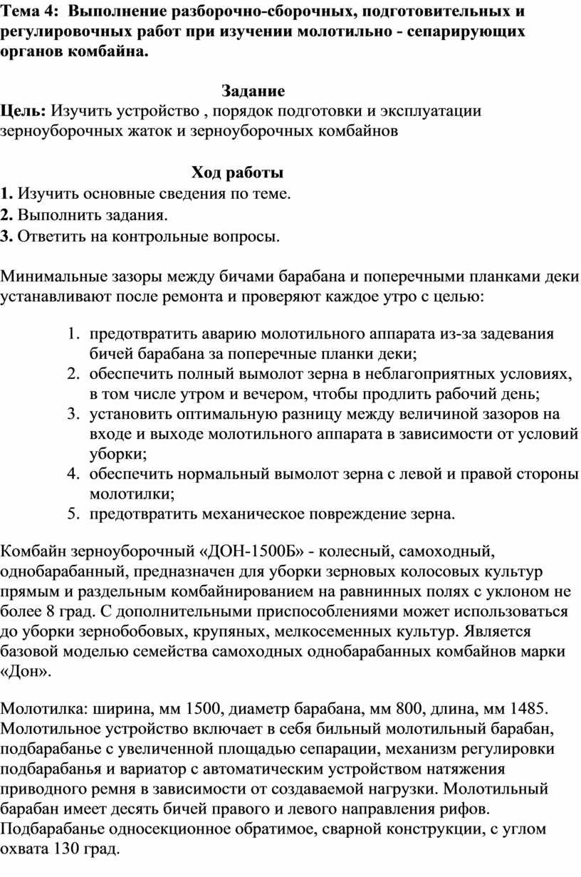 4. Выполнение разборочно-сборочных, подготовительных и регулировочных работ при изучении молотильно - сепарирующих органов комбайна.