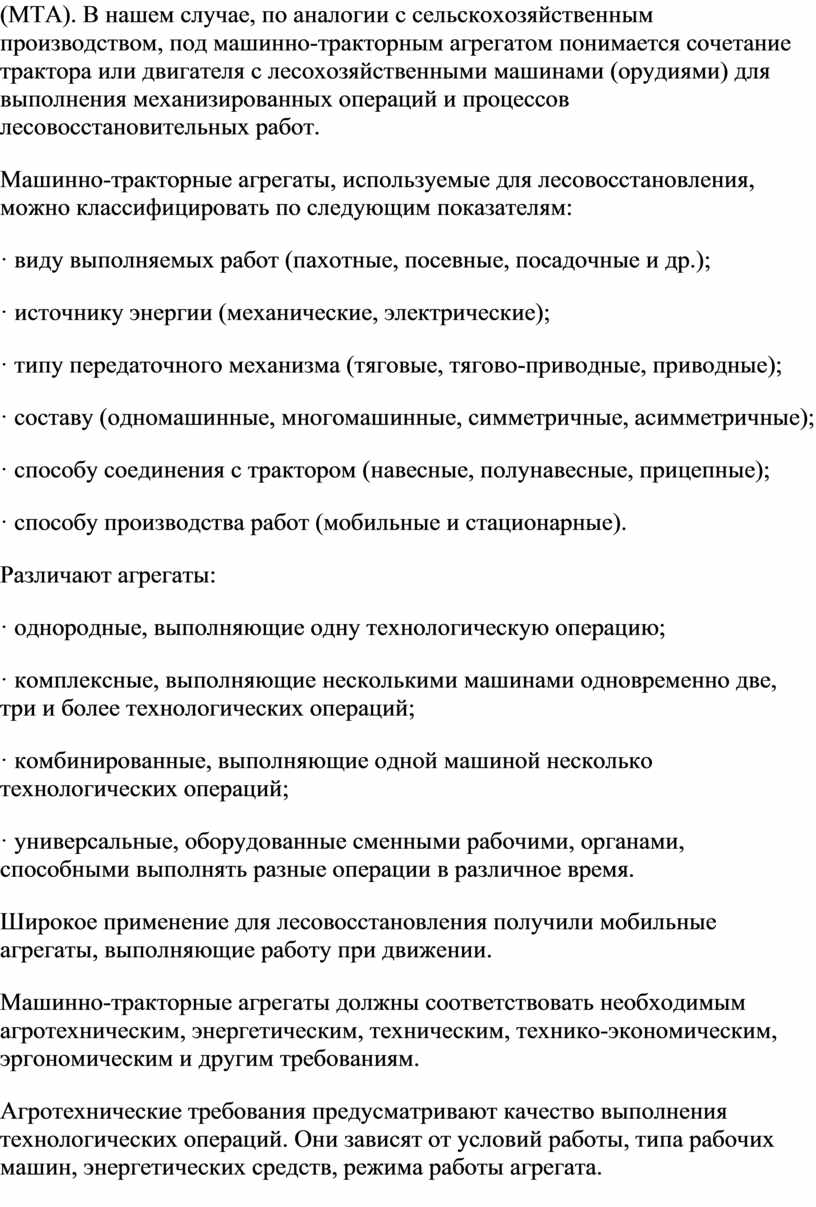 При выполнении любой технологической операции возникает необходимость комплектования агрегата, т.е. для определенной работы нужно подобрать соответствующие трактор и лесохозяйственную машину, орудие или приспособление, иначе говоря, скомпоновать машинно-тракторный агрегат (МТА). В нашем случае, по аналогии с сельскохозяйственным производством, под машинно-тракторным агрегатом понимается сочетание трактора или двигателя с лесохозяйственными машинами (орудиями) для выполнения механизированных операций и процессов лесовосстановительных работ.