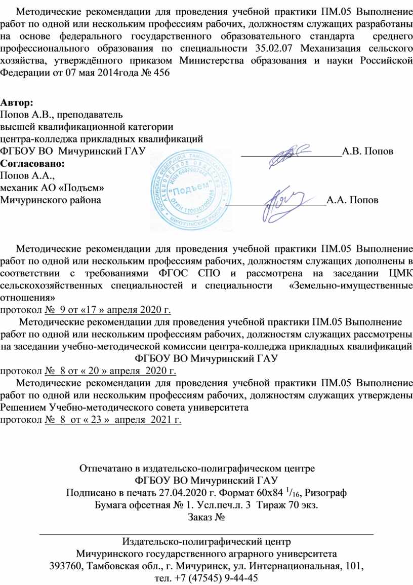 Методические рекомендации для проведения учебной практики ПМ.05 Выполнение работ по одной или нескольким профессиям рабочих, должностям служащих дополнены в соответствии с требованиями ФГОС СПО и рассмотрена на заседании ЦМК сельскохозяйственных специальностей и специальности «Земельно-имущественные отношения»