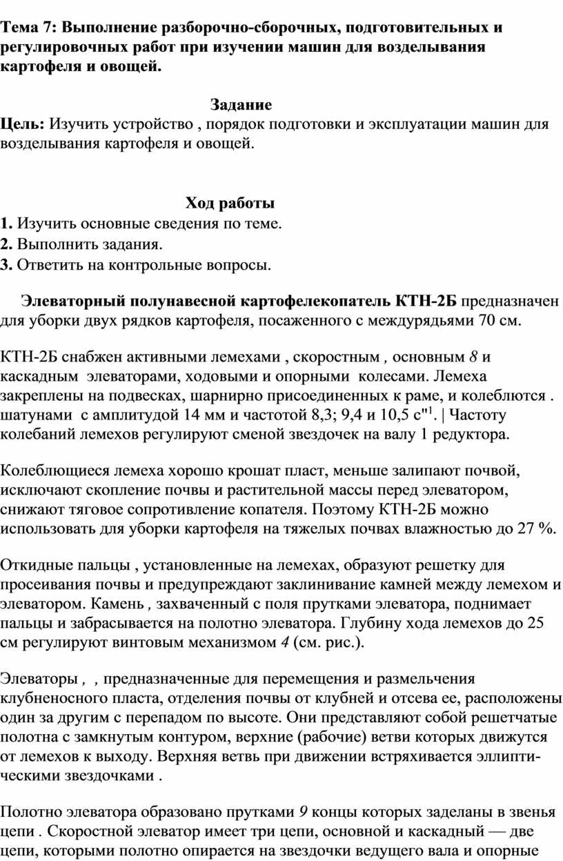 7. Выполнение разборочно-сборочных, подготовительных и регулировочных работ при изучении машин для возделывания картофеля и овощей.