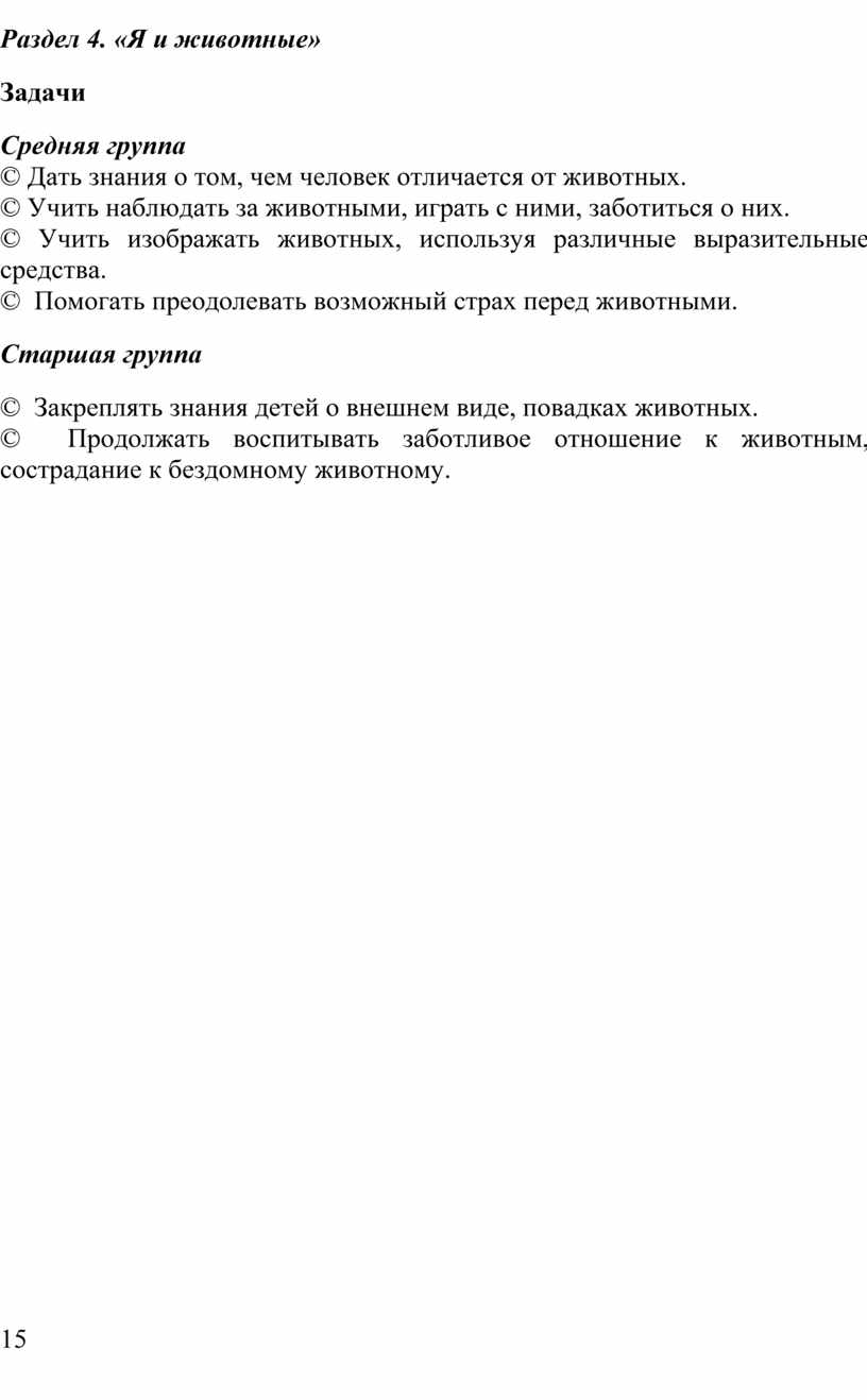 Раздел 4. «Я и животные» (темы: «Мой ласковый и нежный верь», «Общение с животным»). Здесь собраны игры и упражнения, направленные на развитие умения видеть отличия человека от животного, особенности общения разных животных между собой; умения изображать животных, используя различные выразительнее средства; умения переносить все хорошее из мира животных в общение с людьми; на снятие страха перед животными.