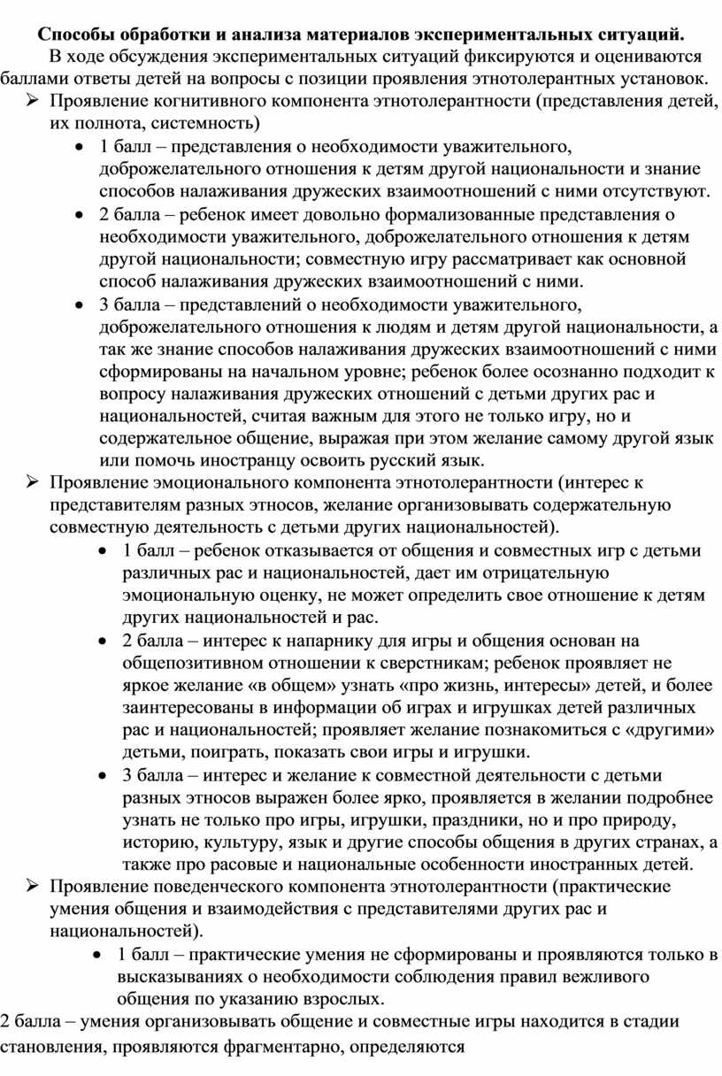 В процессе бесед фиксируются и оцениваются баллами ответы детей на вопросы с позиции проявления этнотолерантных установок.