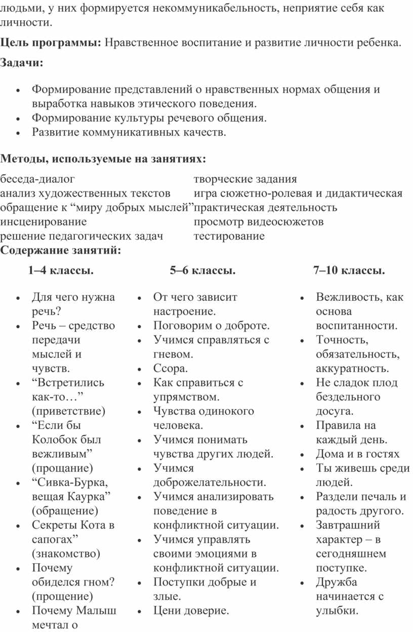 Цель программы: Нравственное воспитание и развитие личности ребенка.