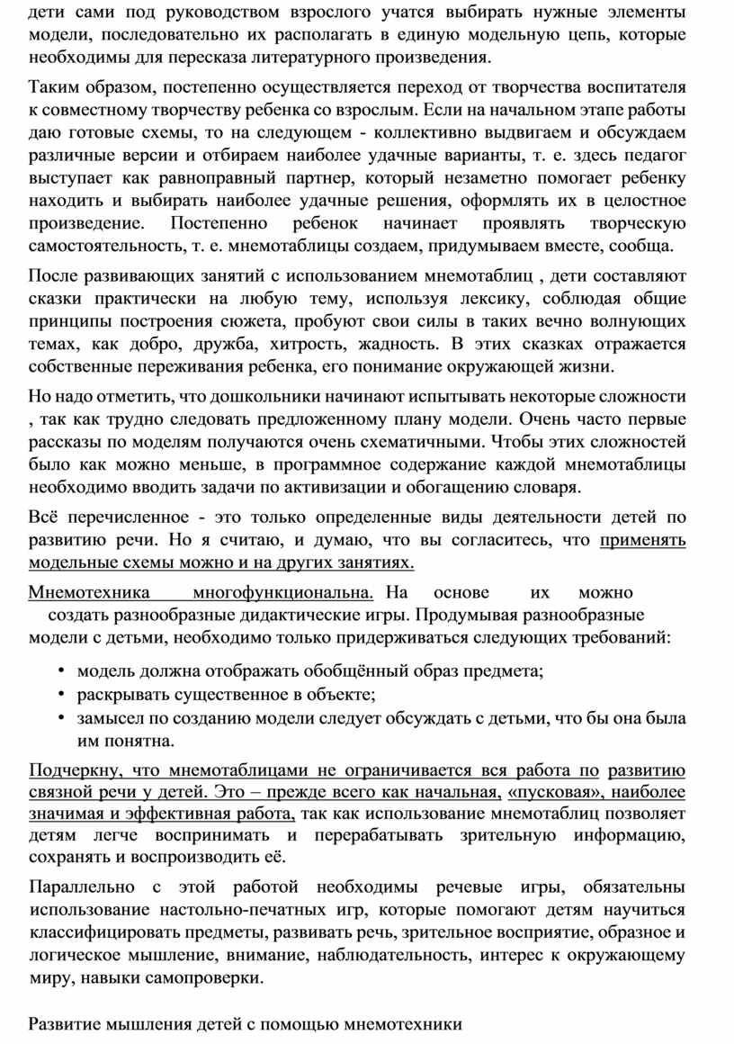 Использование мнемотехники для дошкольников в настоящее время становится более актуальным. Цель обучения развитие памяти, мышления, воображения, внимания, а именно психических процессов, ведь именно они тесно связаны с полноценным развитием речи. Основа обучения – развитие творческого познания.