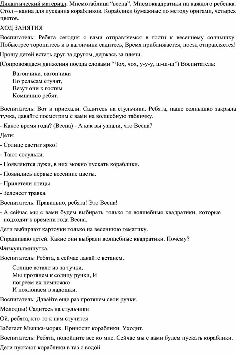 Дидактический материал: Мнемотаблица “весна”. Мнемоквадратики на каждого ребенка. Стол – ванна для пускания корабликов. Кораблики бумажные по методу оригами, четырех цветов.