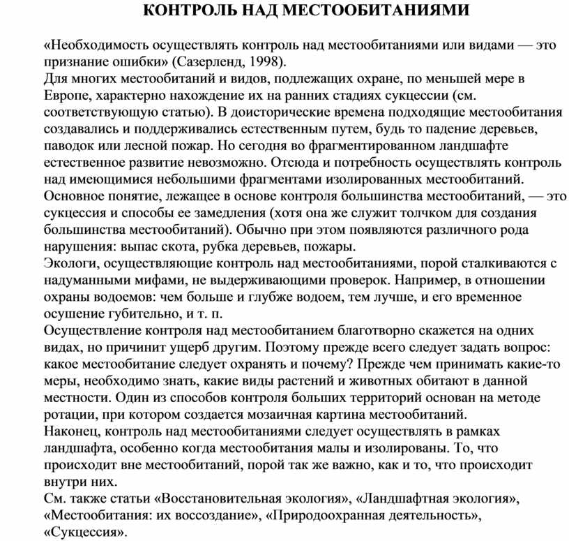 См. также статьи «Восстановительная экология», «Ландшафтная экология», «Местообитания: их воссоздание», «Природоохранная деятельность», «Сукцессия».