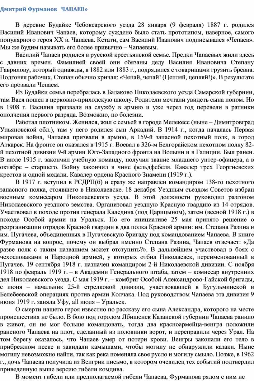 В момент гибели или предполагаемой гибели Чапаева, Фурманова рядом с ним не было, его перевели в другой полк. Тем не менее по книге «Чапаев» и одноименному фильму все знают, что Чапаев находит свою гибель в волнах Урала.