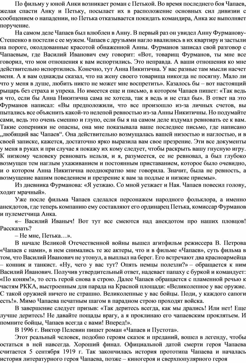 И вот что интересно, в книге Фурманова Петьке уделяется самое незначительное место, а в фильме он уже среди главных героев. Возможно, так произошло из-за того, что худой и усатый Василий Иванович с его любовью к глупо звучащим фразочкам и зачастую непониманием того, о чем его на самом деле спрашивают, чем-то напомнил создателям фильма «знаменитого идальго Дон Кихота Ламанчского», а рыцарю печального образа срочно понадобился оруженосец. «Где мой верный Санчо?» – вскричал новоявленный идальго, и перед ним возник чумазый Петька. Кстати, никакой Анки-пулеметчицы на самом деле не существовало. В книге ее тоже нет. У Фурманова была жена, Анна Никитична Стешенко, за которой открыто ухлестывал Чапаев, что привело к острому конфликту между мужем и предполагаемым любовником. В результате Фурманова даже отозвали из отряда, дабы не дожидаться, когда эти двое поубивают друг друга.