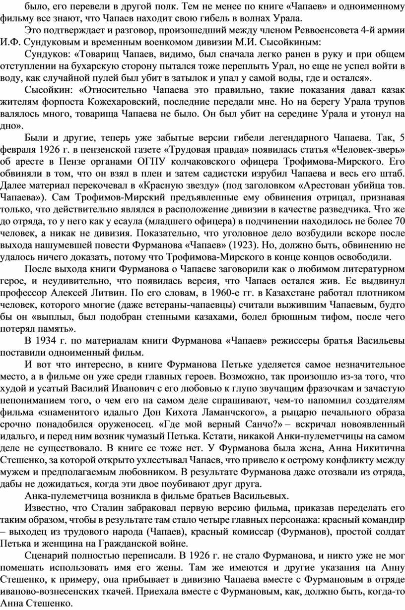 Сценарий полностью переписали. В 1926 г. не стало Фурманова, и никто уже не мог помешать использовать имя его жены. Там же имеются и другие указания на Анну Стешенко, к примеру, она прибывает в дивизию Чапаева вместе с Фурмановым в отряде иваново-вознесенских ткачей. Приехала вместе с Фурмановым, как, должно быть, когда-то Анна Стешенко.
