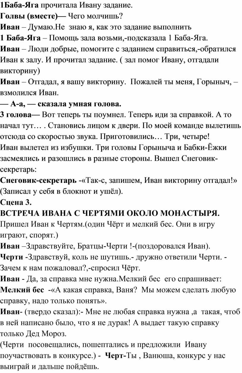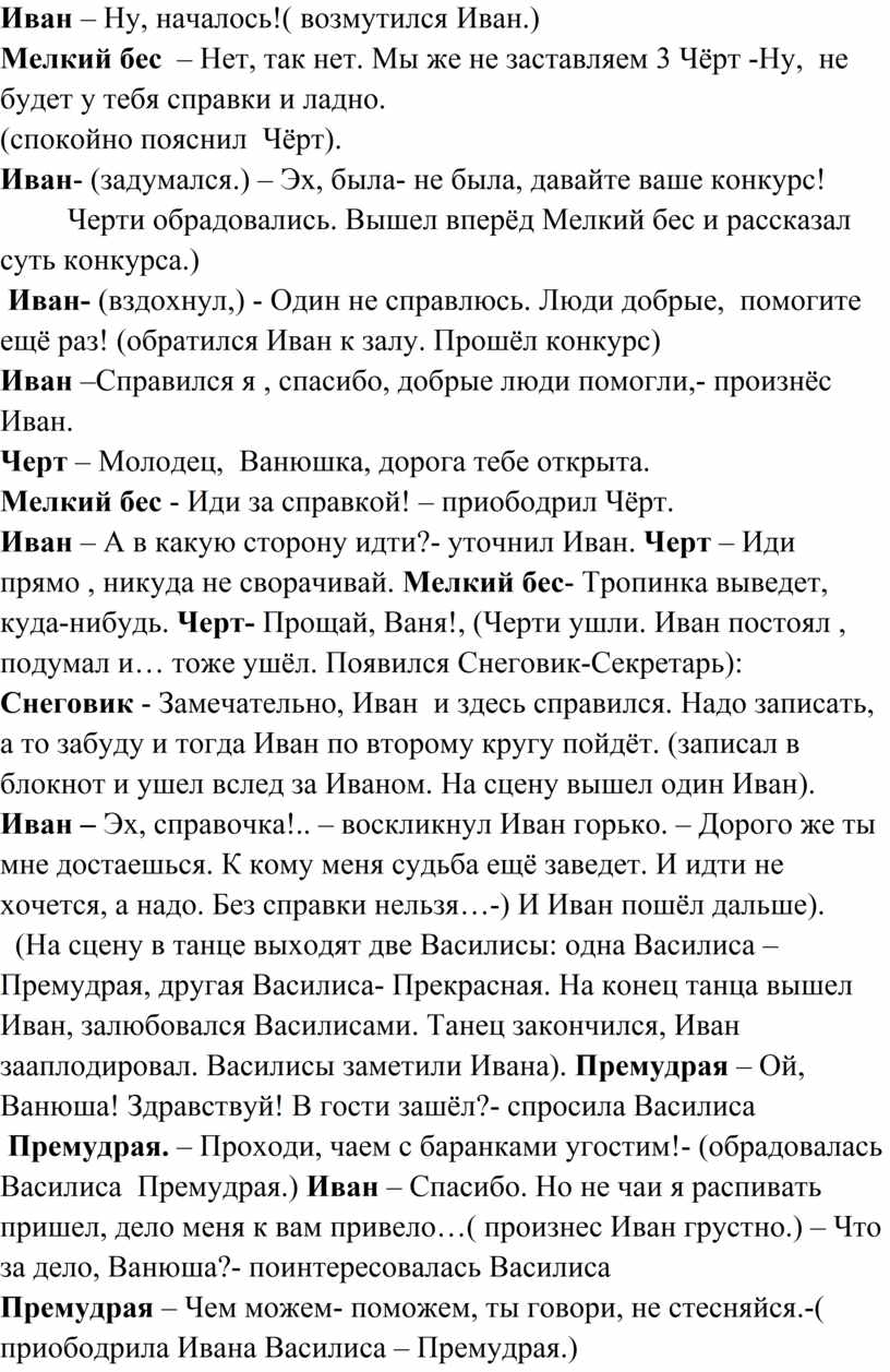 Иван – А в какую сторону идти?- уточнил Иван. Черт – Иди прямо , никуда не сворачивай. Мелкий бес- Тропинка выведет, куда-нибудь. Черт- Прощай, Ваня!, (Черти ушли. Иван постоял , подумал и… тоже ушёл. Появился Снеговик-Секретарь):