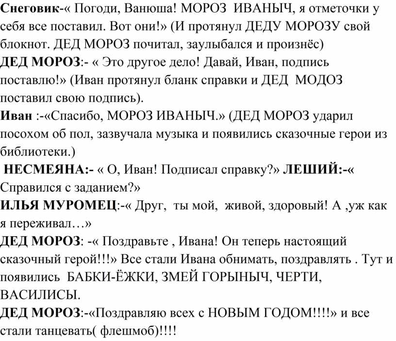 Снеговик-« Погоди, Ванюша! МОРОЗ ИВАНЫЧ, я отметочки у себя все поставил. Вот они!» (И протянул ДЕДУ МОРОЗУ свой блокнот. ДЕД МОРОЗ почитал, заулыбался и произнёс)