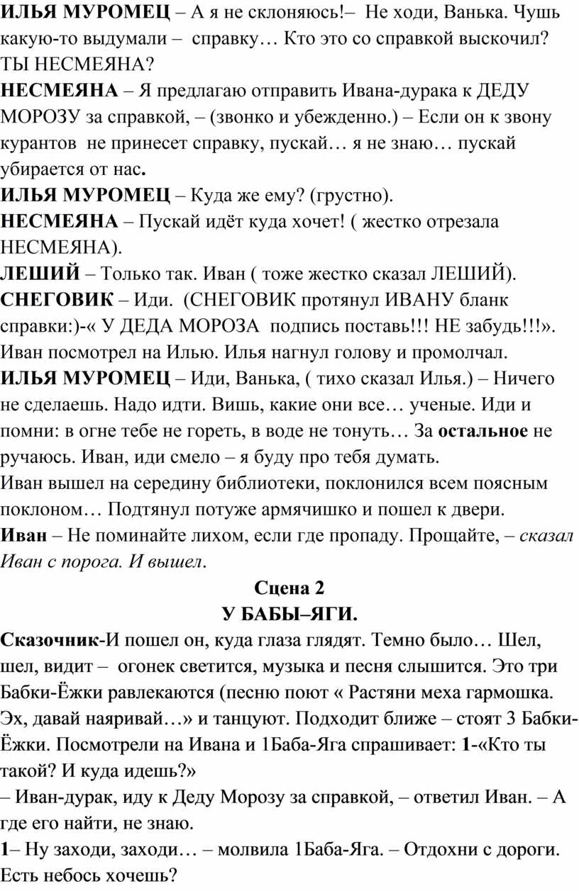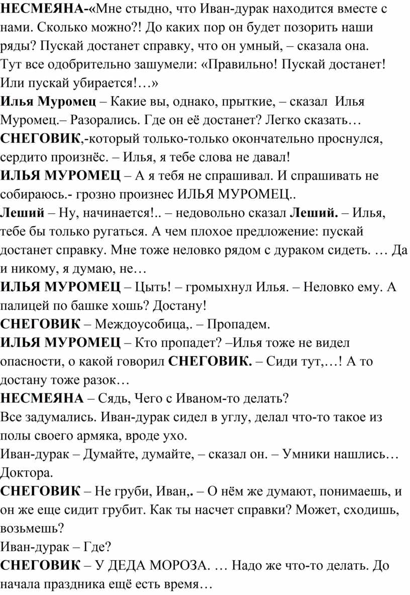ИВАН- обрадовано :-« Обязательно!». НЕСМЕЯНА недовольно:-« Илья, ты думаешь, что говоришь? Как с нами ДУРАК может пойти? И потом: ДЕД МОРОЗ только сказочных ГЕРОЕВ пригласил, а Ванька , просто , дурак!». Леший:-« Мне вообще стыдно, что среди нас, сказочных ГЕРОЕВ, есть Иван-ДУРАК!».